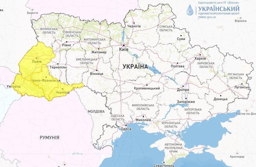 Український гідрометеорологічний центр попереджає про небезпечні гідрометеорологічні явища в Україні. 23 серпня у Львівській, Івано-Франківській, Чернівецькій та Закарпатській областях грози, значні дощі/ І рівень небезпечності, жовтий