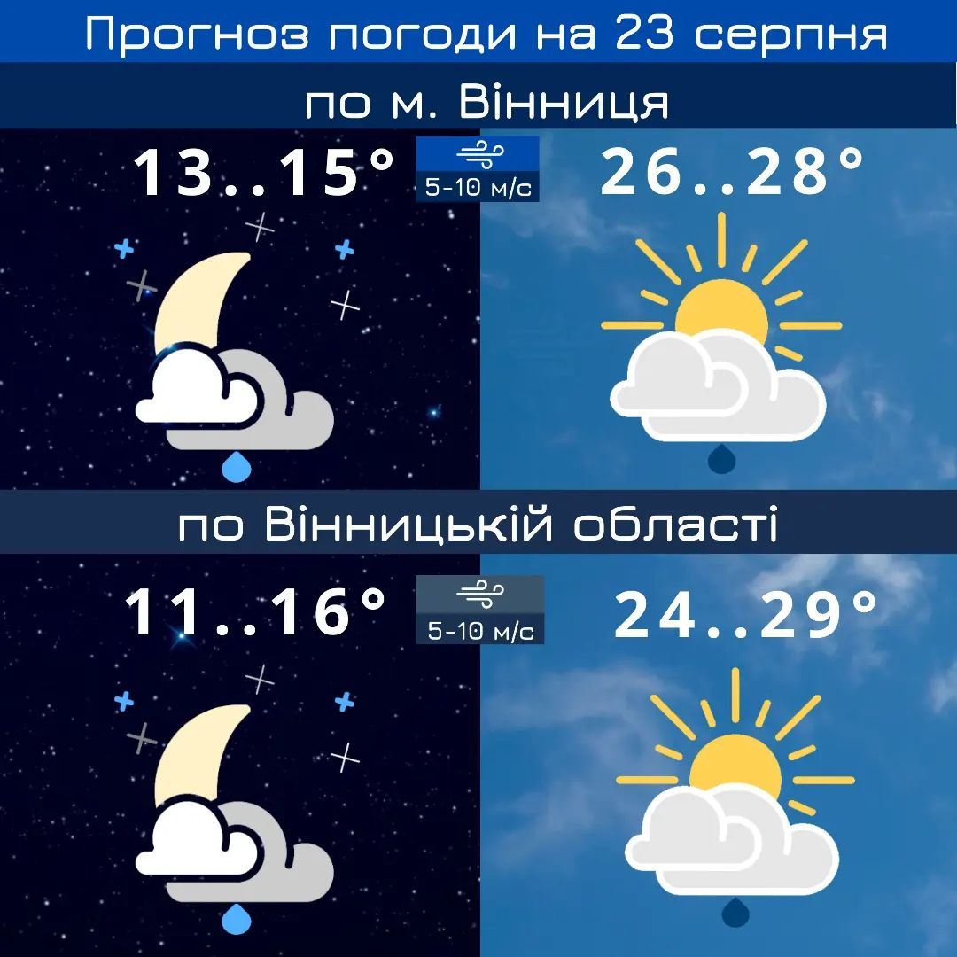 Прогноз погоди по Вінницькій області на середу 23 серпня.
