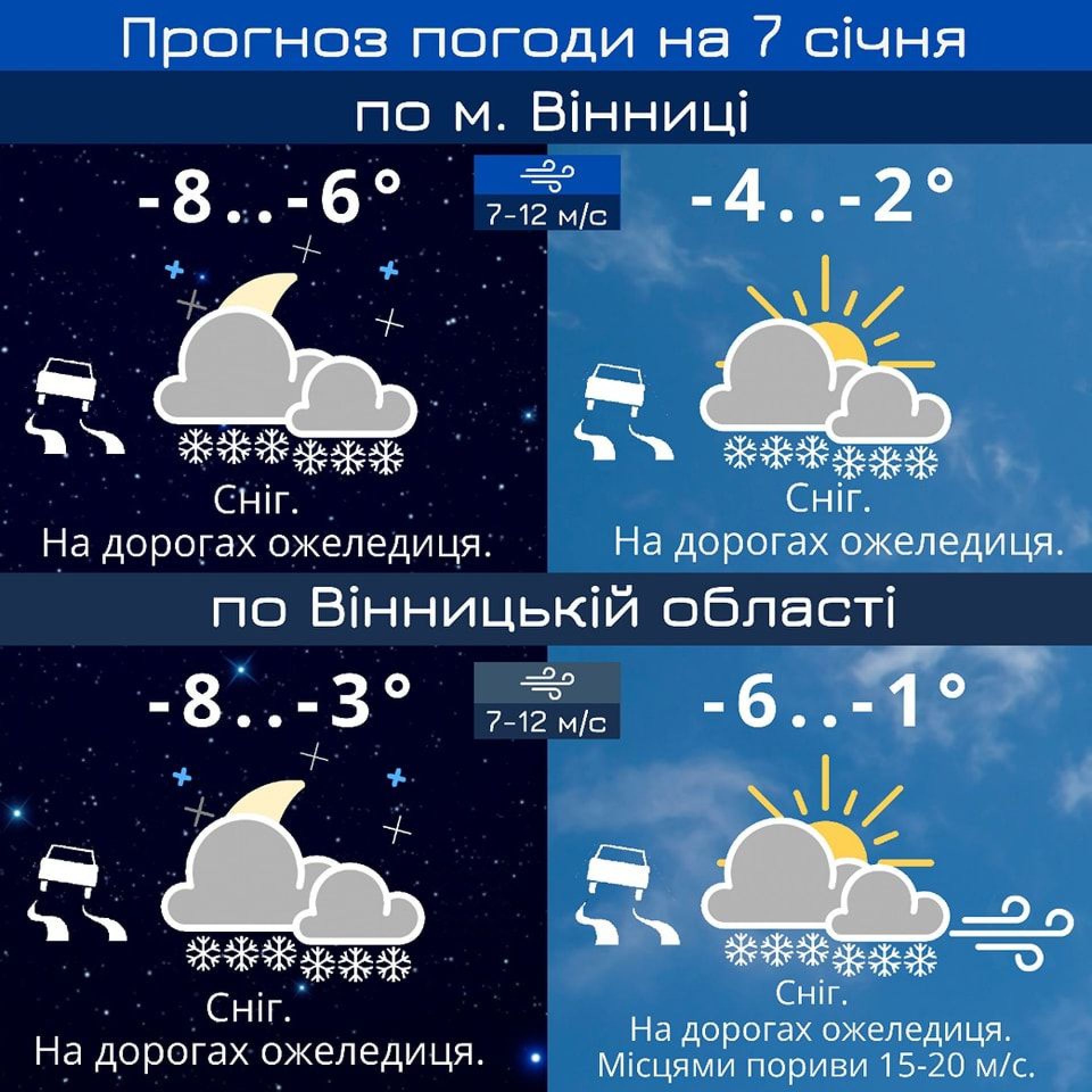 Вінницький обласний центр з гідрометеорології на 7 січня на Вінниччині прогнозує сніг та ожеледицю. Вітер 7-12 м/с, вдень місцями пориви 15-20 м/с. Температура вночі 3-8° морозу, вдень 1-6° морозу.