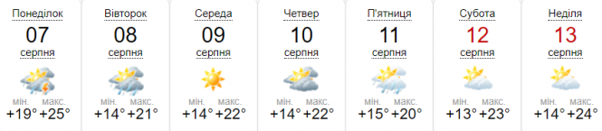 Сайт sinoptik.ua на наступний тиждень у Козятині передає від +13 до +25 градусів. Дощі будуть, але не багато.