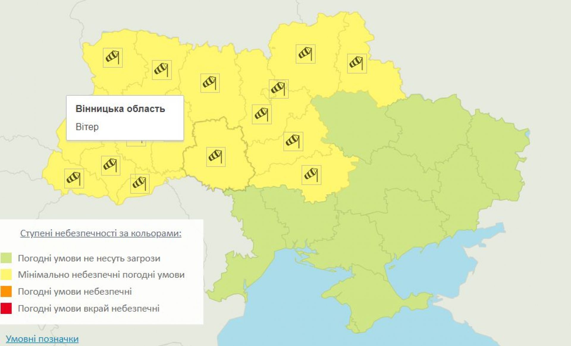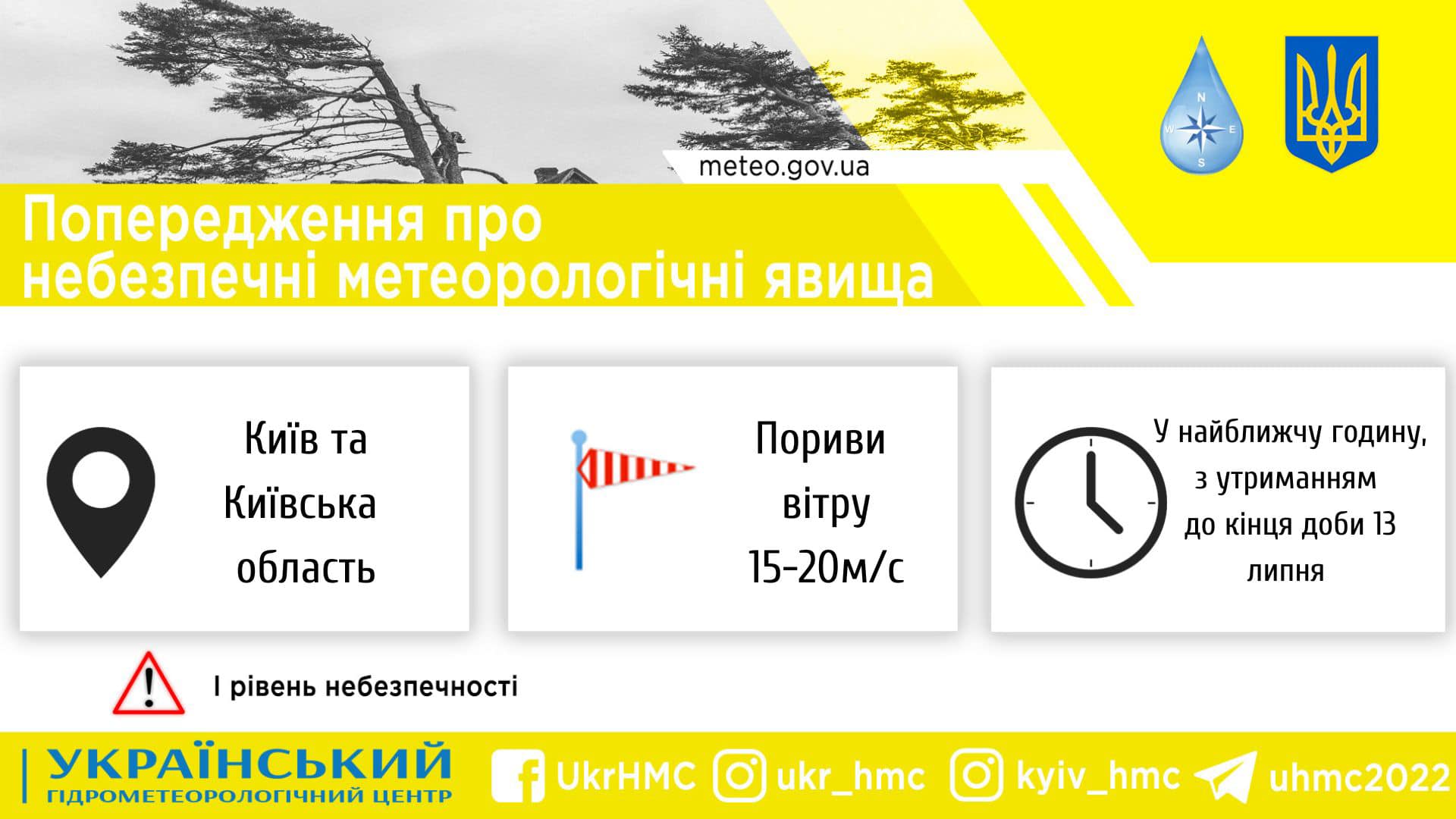 — У найближчу годину з утриманням до кінця доби 13 липня у західних, північних та більшості центральних областей пориви 15-20 м/с (І рівень небезпечності, жовтий), — йдеться у повідомленні.