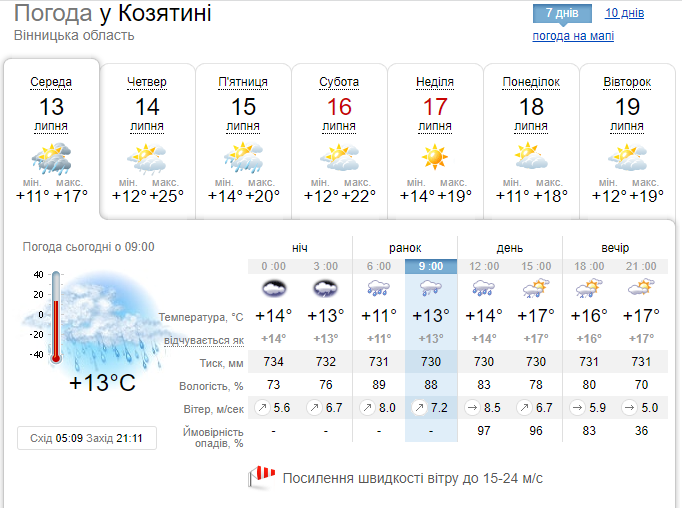 - Сьогодні, 13 липня половина країни опинилася у жовтій погодній зоні. Вінницька область також у цьому списку.