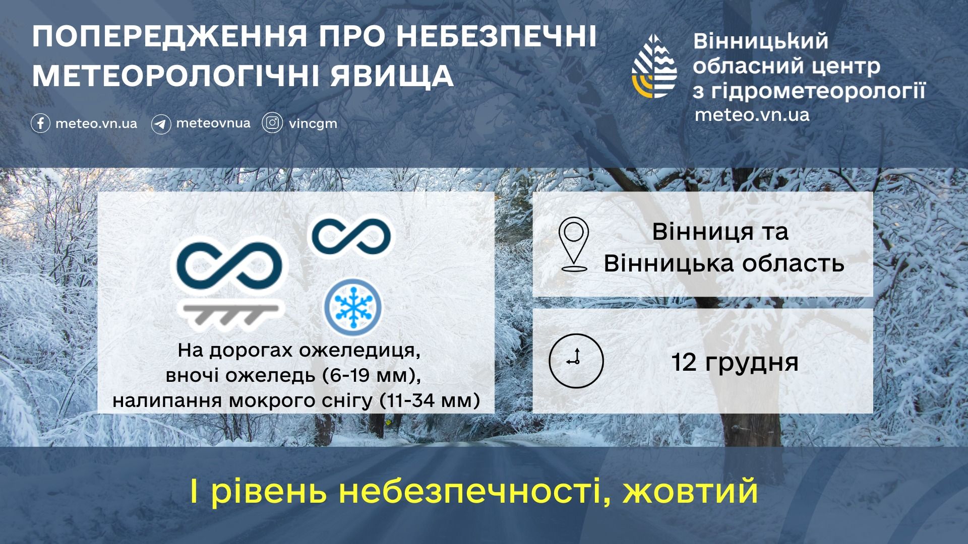 У четвер, 12 грудня на дорогах Вінниччини очікується ожеледиця, вночі ожеледь 6-19 мм), налипання мокрого снігу(11-34 мм). І рівень небезпечності.