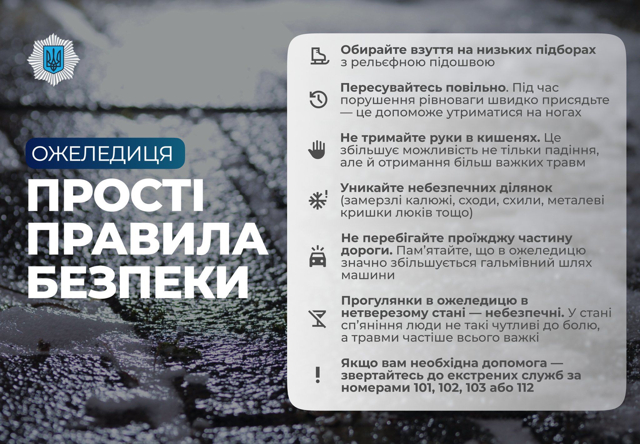 — Не дайте зимовим погодним умовам застати вас зненацька. Памʼятайте про основні правила поведінки під час ожеледиці . Обирайте зручне взуття з рельєфною підошвою, пересувайтеся повільно та маленькими кроками, уникайте особливо слизьких ділянок та не тримайте руки в кишенях. Якщо так сталося, що ви впали та потребуєте допомоги — звертайтесь до екстрених служб за номерами 101, 102, 103 або 112. — наголошують правоохоронці