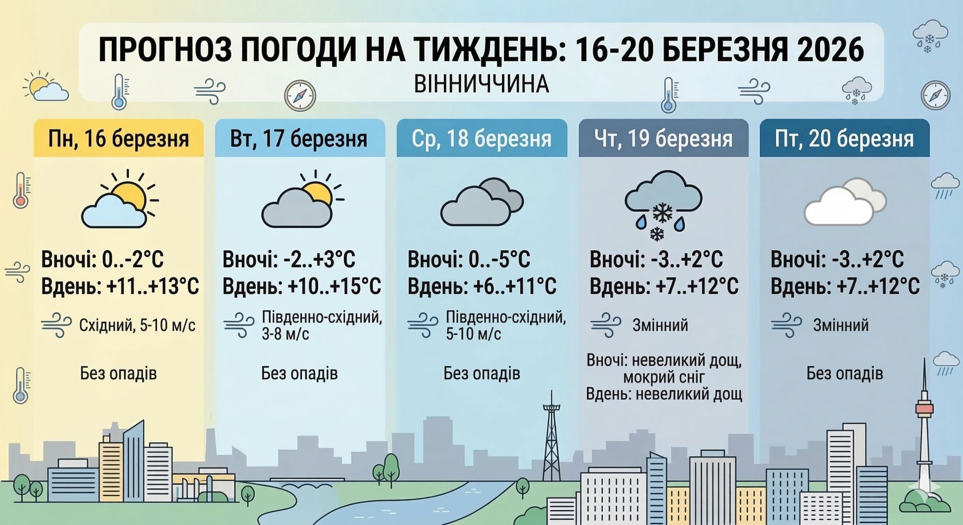 Понеділок та вівторок стануть справжнім подарунком для тих, хто сумував за сонцем. Повітря у Вінниці прогріється до солідних +13...+15°C, хоча нічні морози до -2° ще нагадуватимуть про календарний березень. Це ідеальний час для прогулянок та планів на свіжому повітрі. Проте вже в середу, 18 березня, вітер змінить настрій, а денна температура «просяде» до +6...+11°C. Це буде лише прелюдія до головної погодної події тижня.