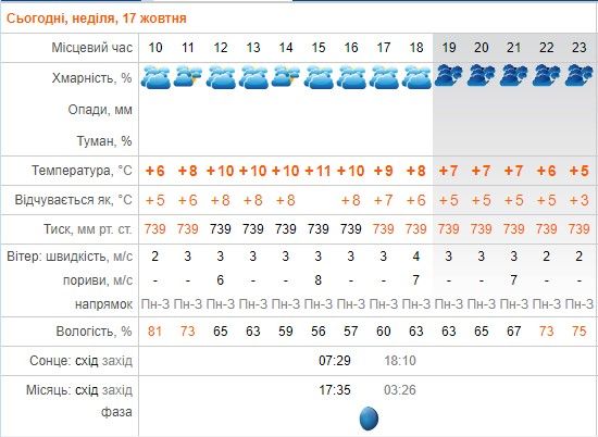 На сайті rp5.ua віщують похмуру погоду, температура повітря вдень до +11