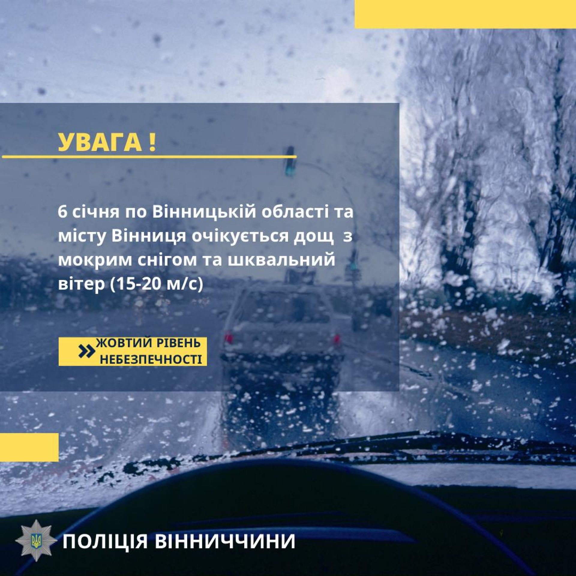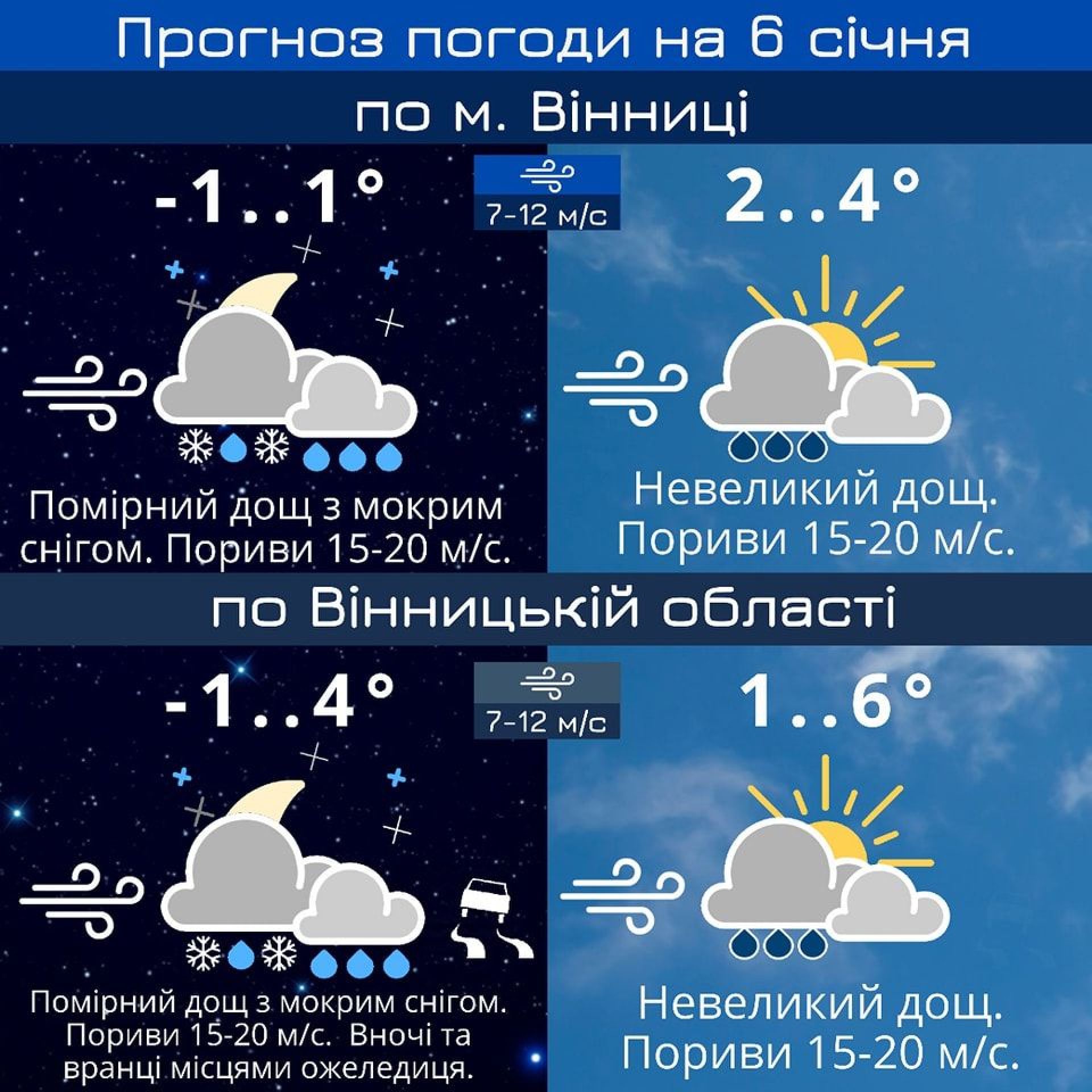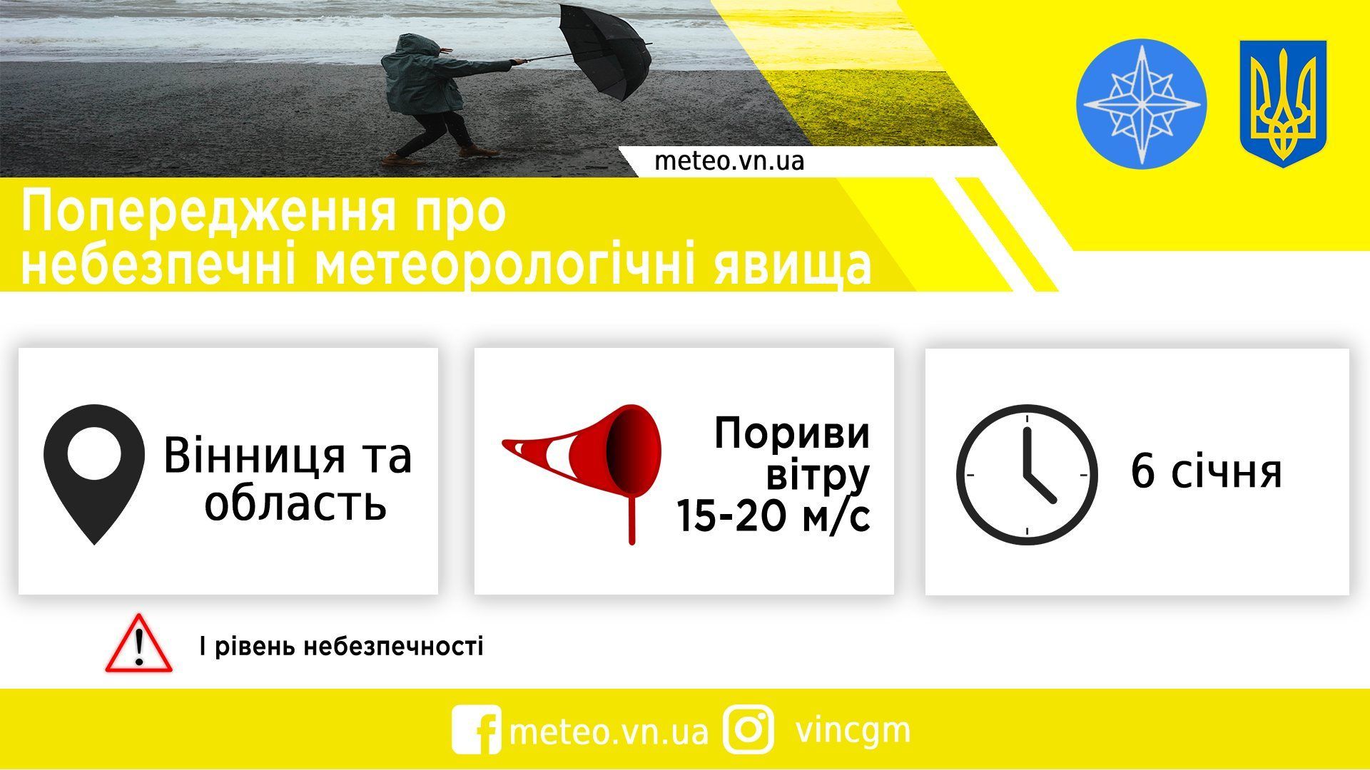 За повідомленням Вінницького обласного центру з гідрометеорології, 6 січня по області очікуються пориви вітру 15-20 м/с. (1 рівень небезпечності, жовтий).