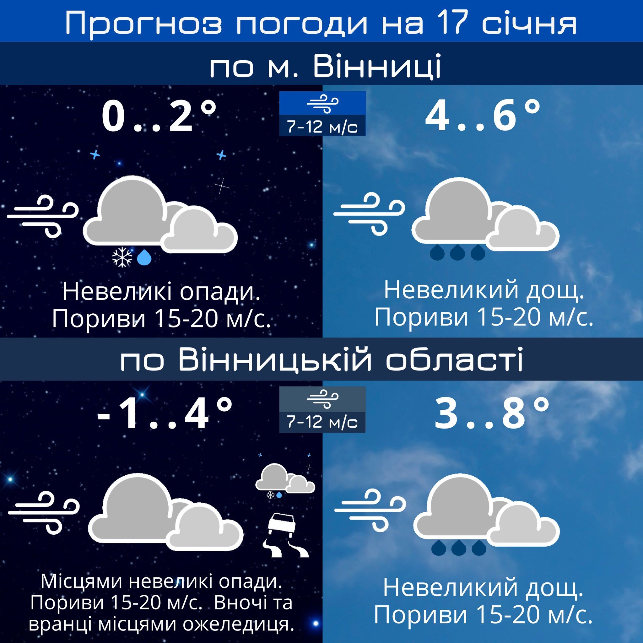 - Завтра, 17 січня по всій території України, в тому числі і на Вінниччині, очікуються пориви вітру 15-20 м/с.
