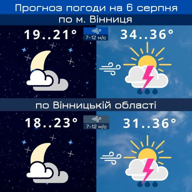 Вінницький обласний центр з гідрометеорології на 6 серпня по Вінницькій області передає мінливу хмарність. Вночі без опадів. Вдень короткочасний дощ, гроза. Вітер південно-східний, 7-12 м/с, вдень пориви 15-20 м/с. Температура вночі 18-23°, вдень 31-36°.