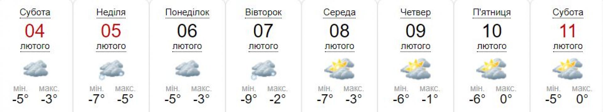 - 6-7 лютого: часом невеликий сніг. Температура вночі 6-11° морозу, вдень 1-6° морозу.
