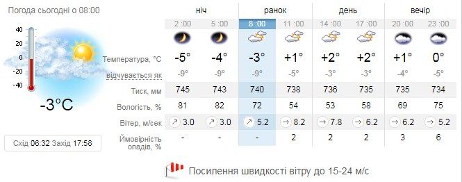 Не забувайте вдома шалик і рукавички, дуже помічною якраз буде маска – бо холодний вітер «обпікатиме» обличчя, руки.» – так написала у фейсбуці про погоду на сьогодні синоптик Наталка Діденко.– «Найближчими днями ще побуде холодна погода, а ось наступні вихідні обіцяють бути веселішими, з п'ятниці температура повітря підвищиться до +7+10 градусів.»