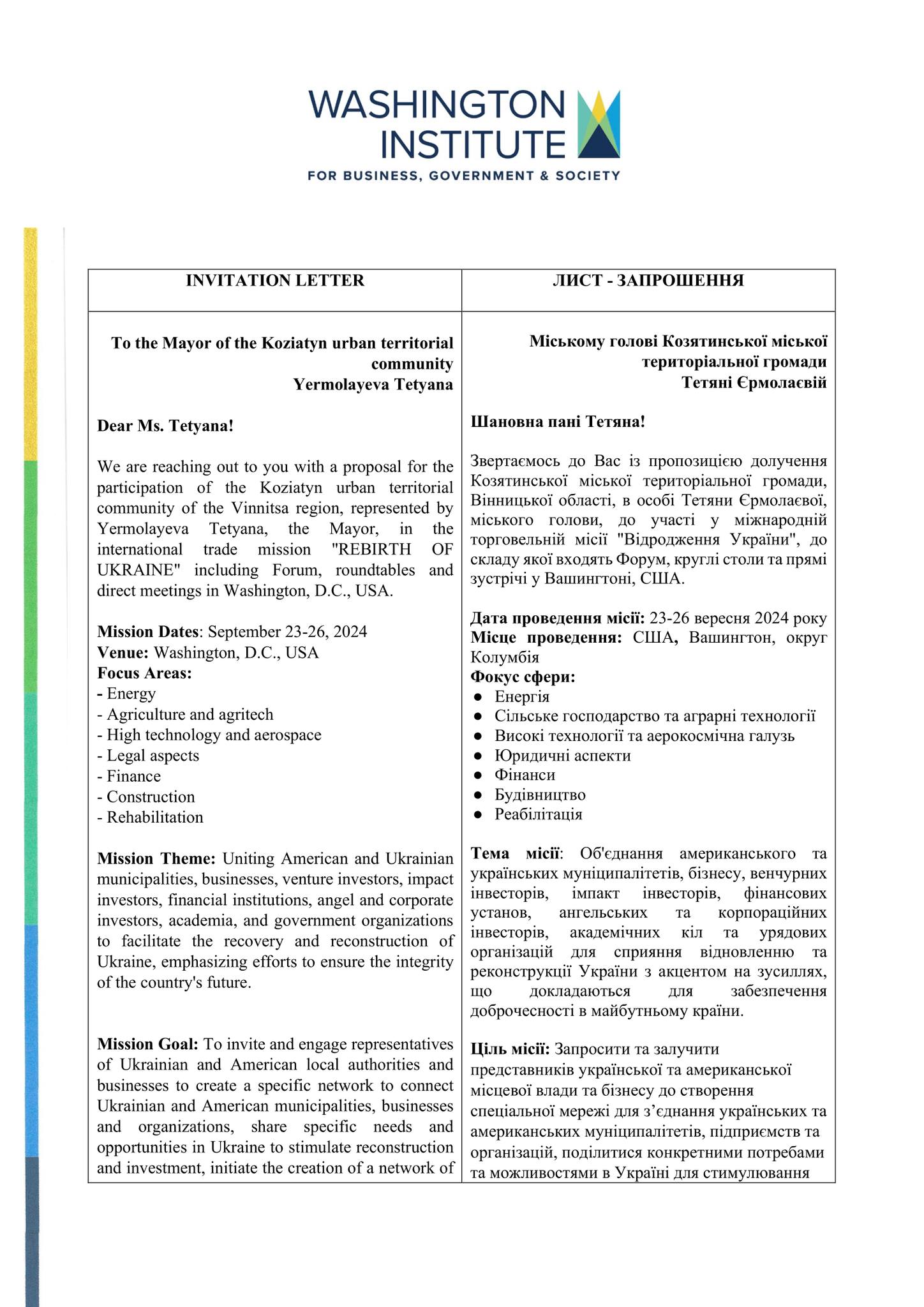 - Очільниця Козятинської територіальної громади Тетяна Єрмолаєва анонсувала свою про поїздку у Вашингтон.