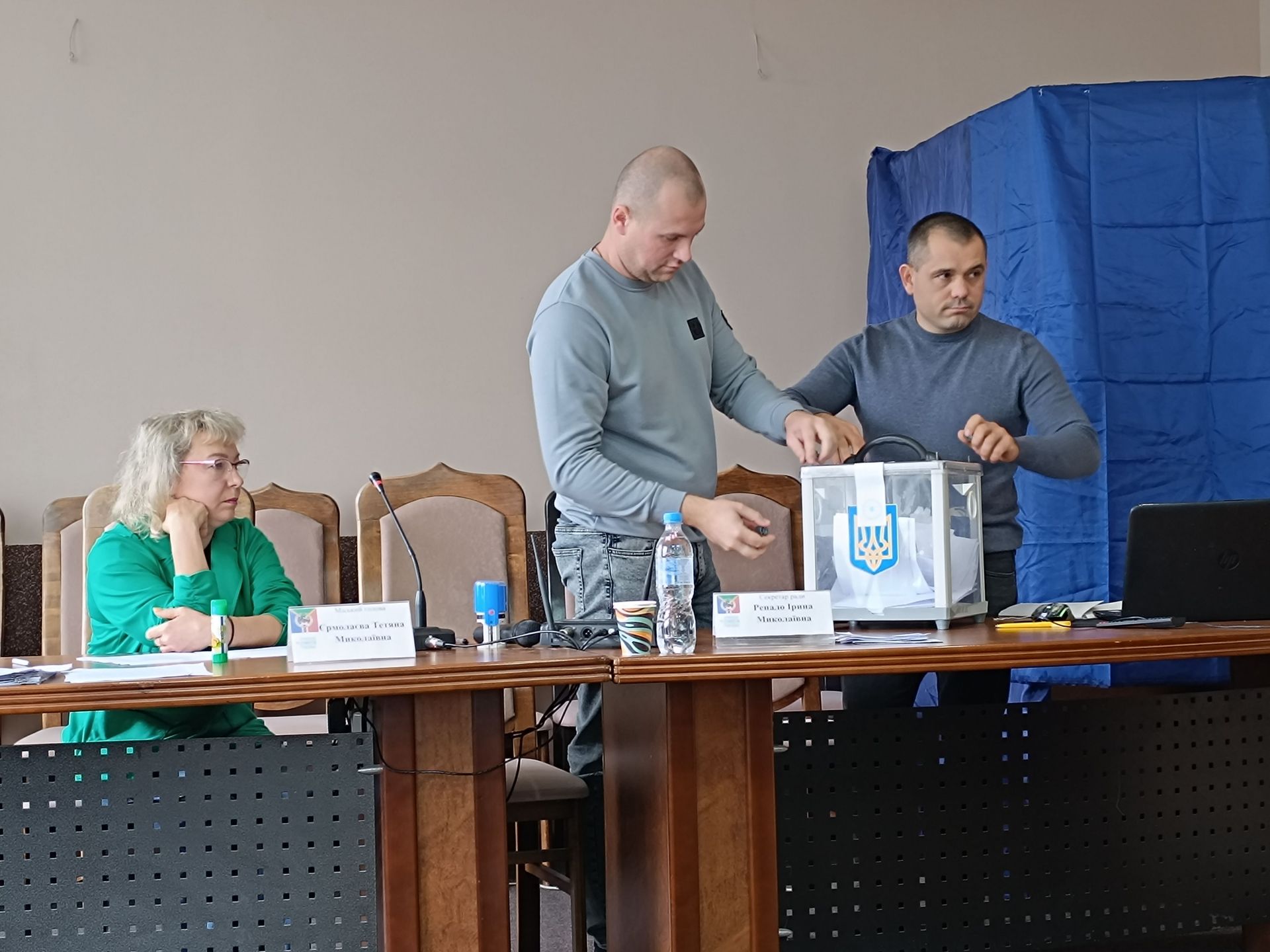 Тетяна Єрмолаєва встала з-за столу і сіла поряд із депутатським корпусом. За процедурою перед тим, як приймати рішення про дострокове припинення повноважень міського голови, спершу необхідно було провести таємне голосування. Зібралася лічильна комісія у складі депутатів від «Слуги народу» Євгенія Малащука, «Європейської солідарності» Людмили Кудимець та «Української стратегії Гройсмана» Олександра Грінченка. Вони підготували бюлетені. Місцем для проведення голосування визначили кабінку, яку облаштували безпосередньо у сесійній залі. Депутат від «Слуги народу» Олександр Пузир вніс пропозицію перевірити кабінку на наявність камер чи інших пристроїв. Визначили, що перевірку має провести представник правоохоронних органів. Євгеній Трайдакало оглянув кабінку і повідомив, що жодних пристроїв всередині не виявив.