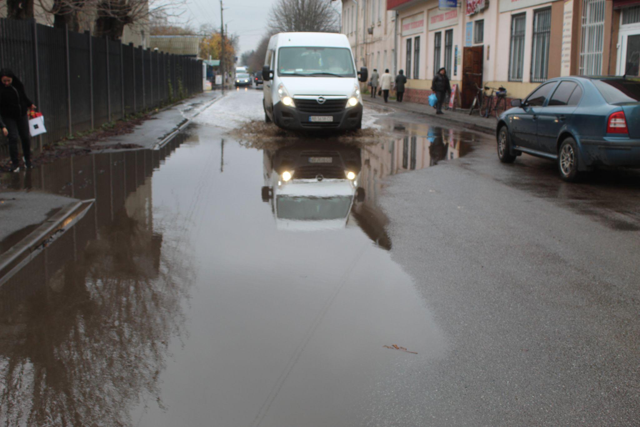 Вулиця Винниченка у нас знаменита великою калюжею. Під час рясного дощу дорога залита водою на всю ширину вулиці. Зовсім недавно тут у калюжі загорілася автівка. За попередніми висновками, ніби як через проблеми з проводкою. А от спеціалісти, які добре розбираються в автівках, не виключають, що замикання могло статися через потрапляння на дроти води з калюжі.