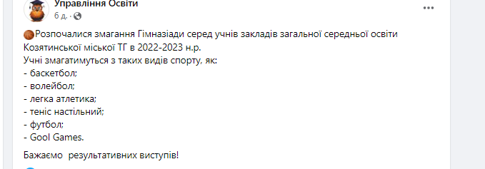 - Тиждень тому Управління освіти Козятинської міської ради анонсувало змагання Гімназіади серед учнів закладів загальної середньої освіти Козятинської міської ТГ в 2022-2023 н.р.