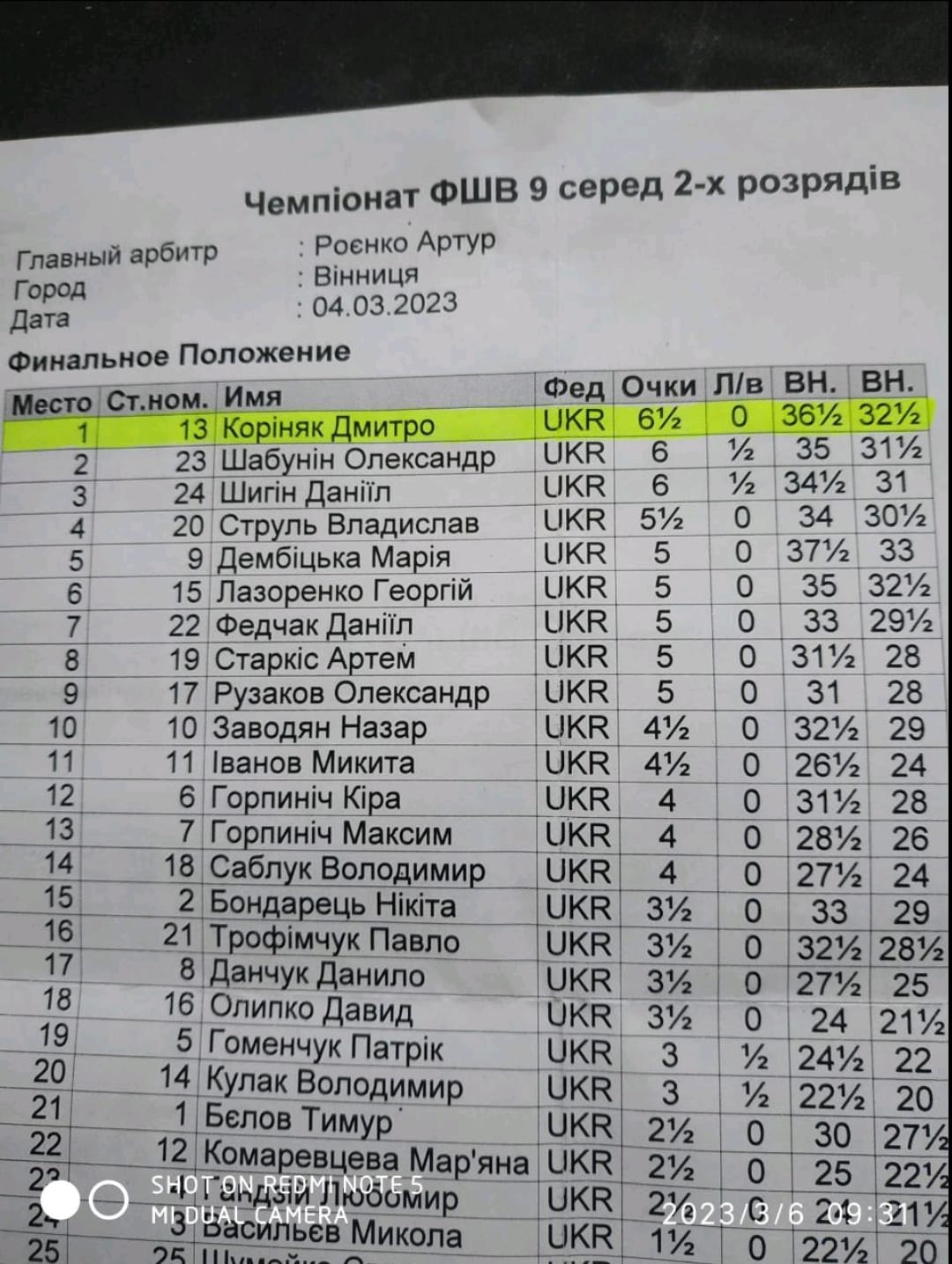 — Найнапруженіша остання партія турніру і наш Дмитро Коріняк став одноосібним переможцем чемпіонату, здобувши 6,5 очок з 8-ми можливих. За підсумками турніру він єдиний з усіх учасників виконав норматив першого дорослого розряду. З цим вагомим здобутком поздоровляємо нашого шахіста та його керівника, — йдеться у повідомленні