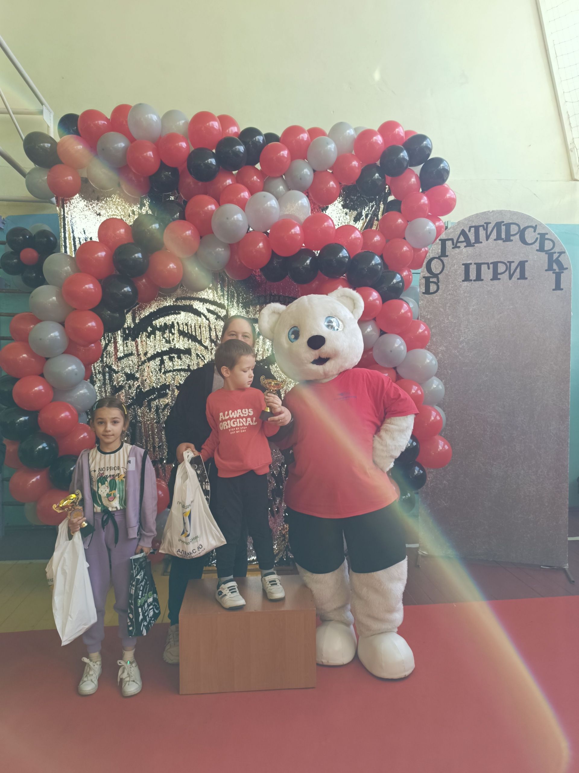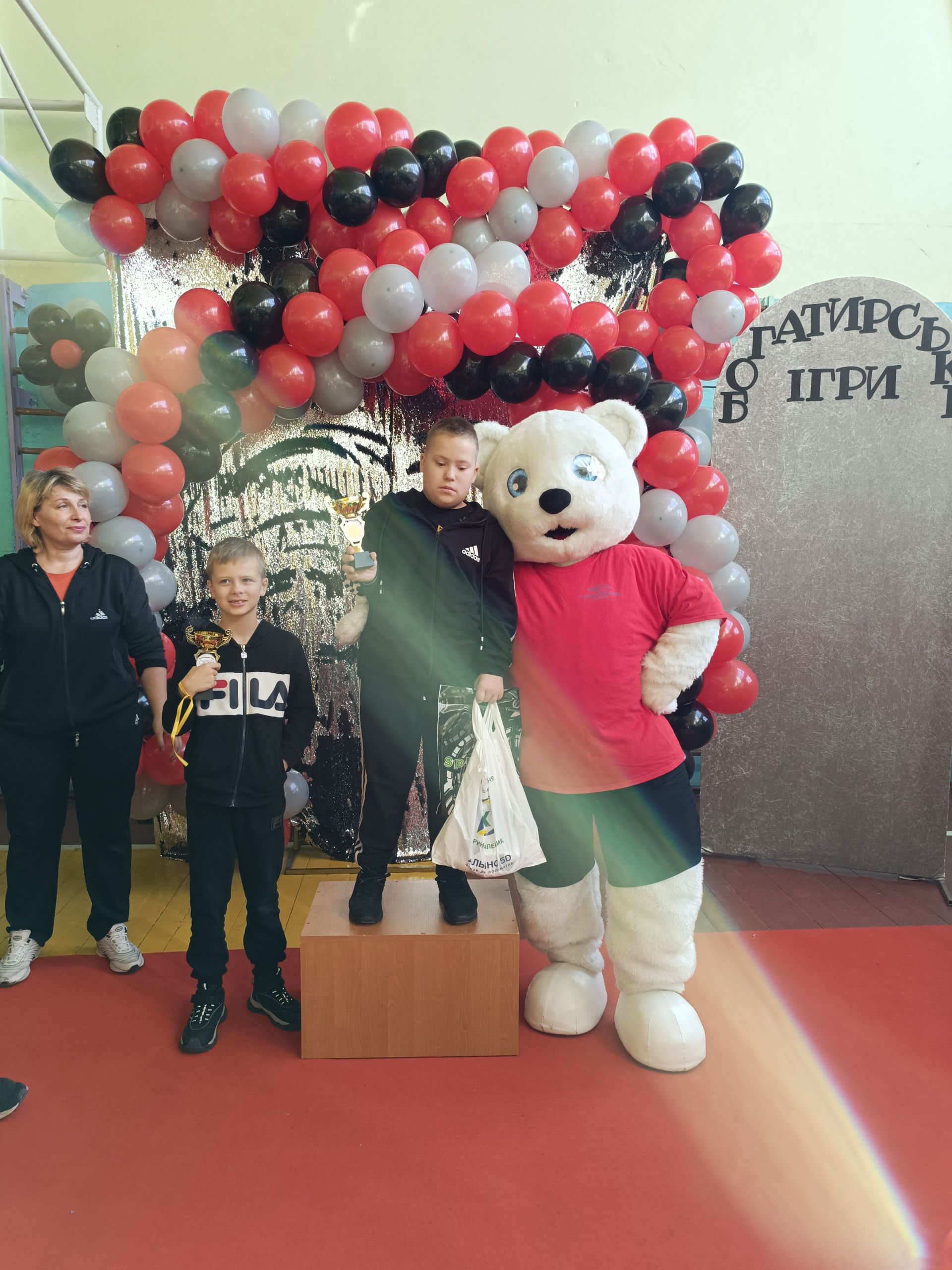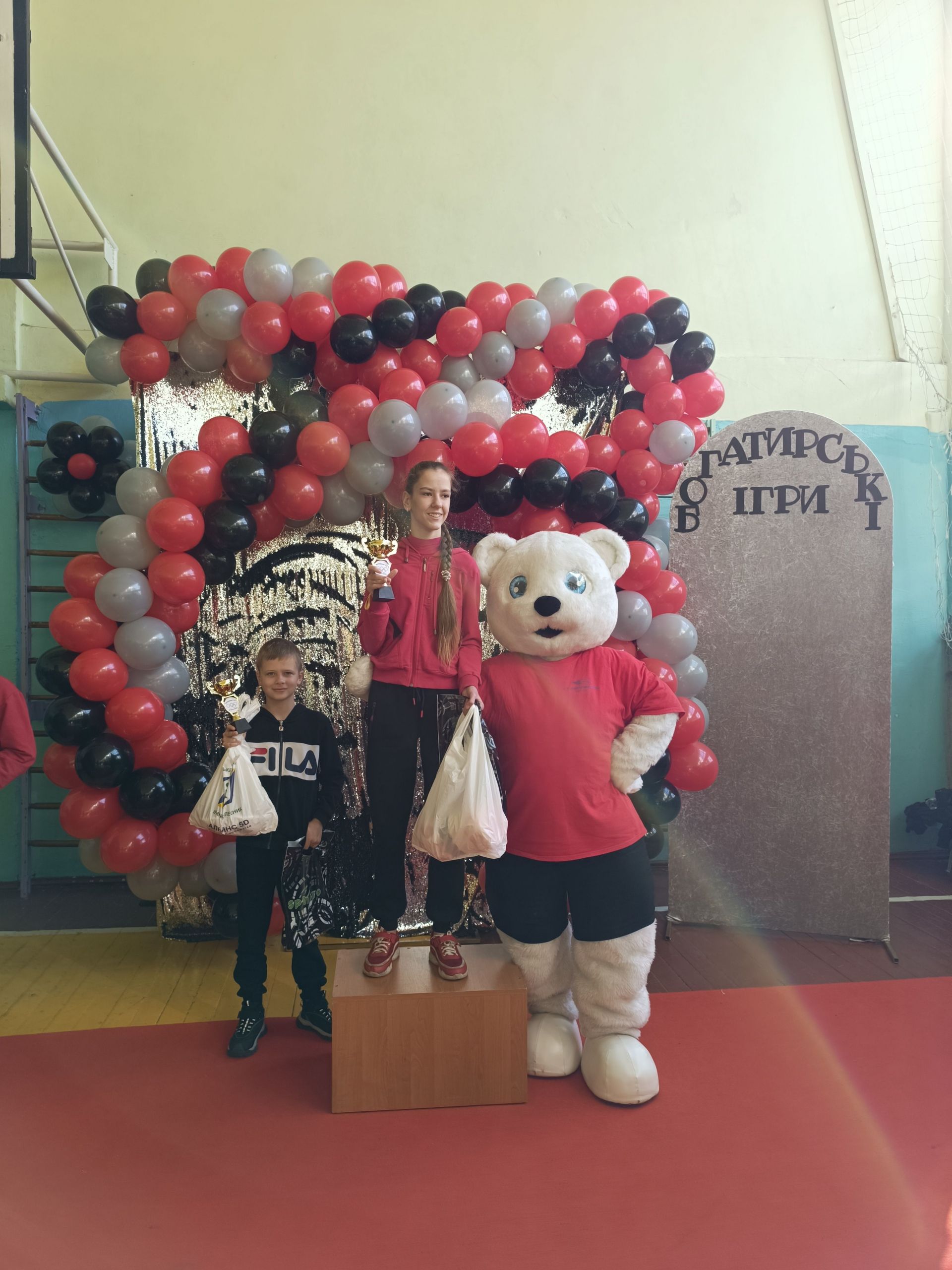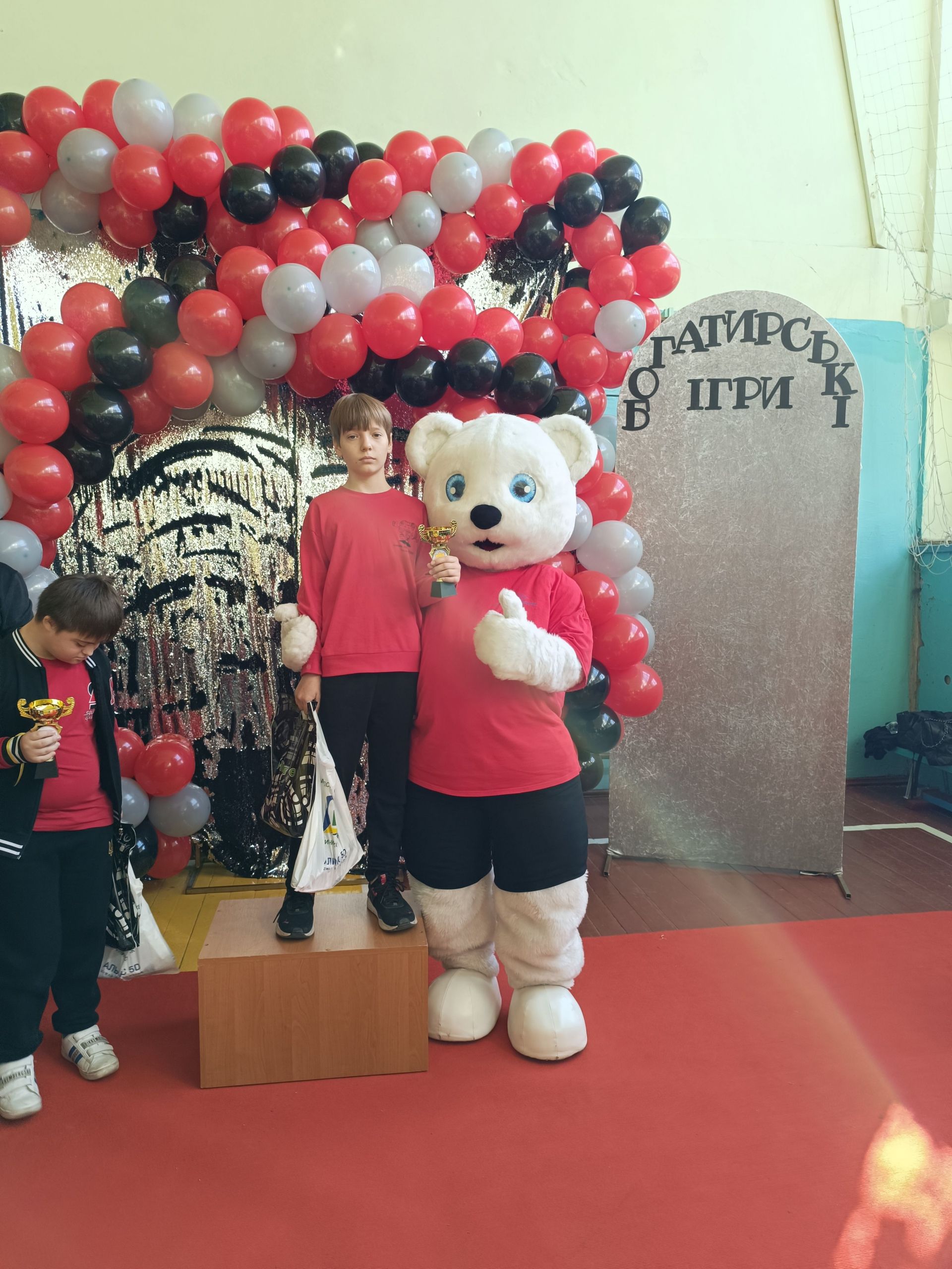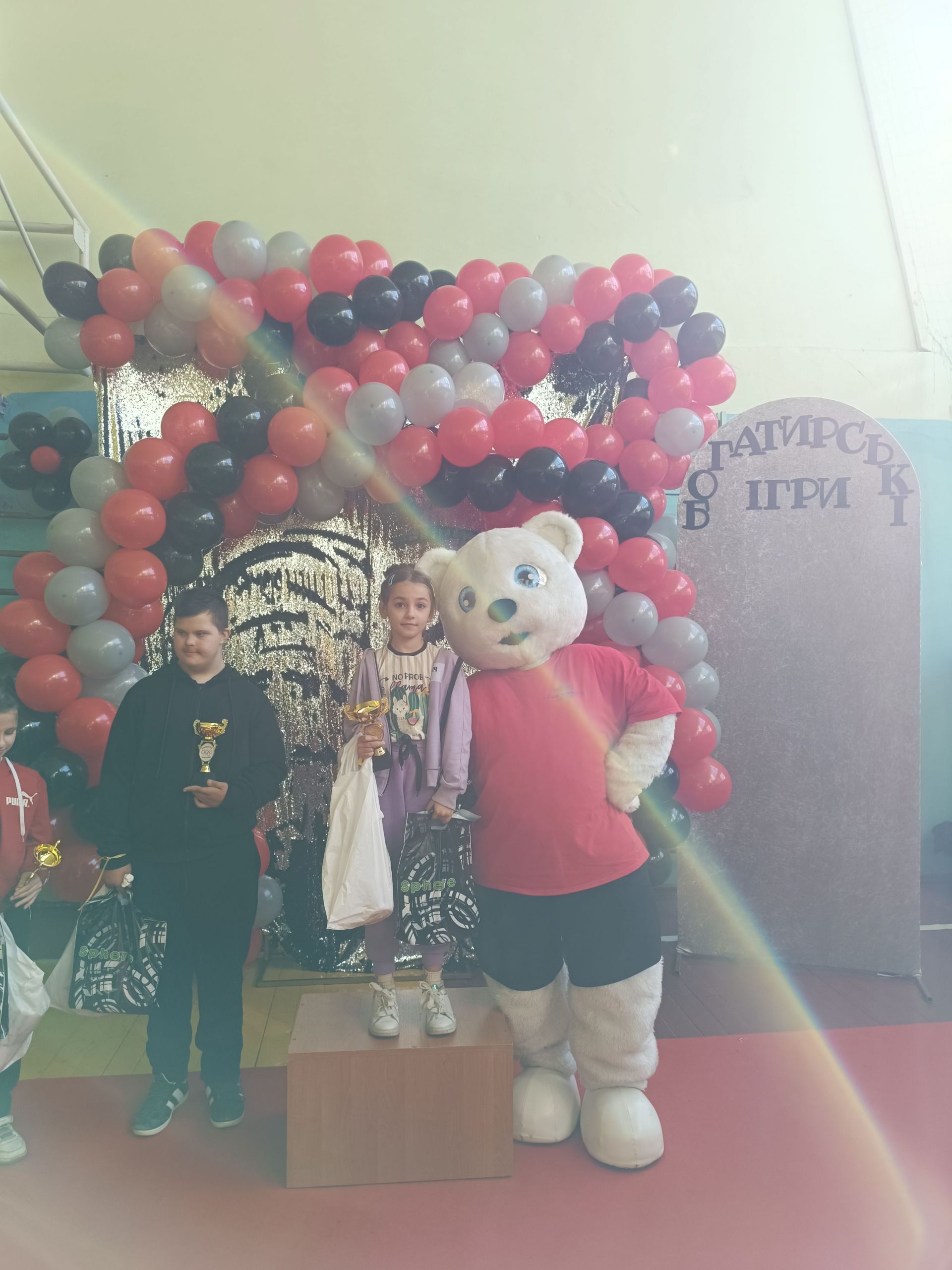 До зали увійшов великий ведмідь, дав дітям п’ять і став поруч із п’єдесталом. Учасники Богатирських ігор отримували призи і фотографувалися із ведмедиком.