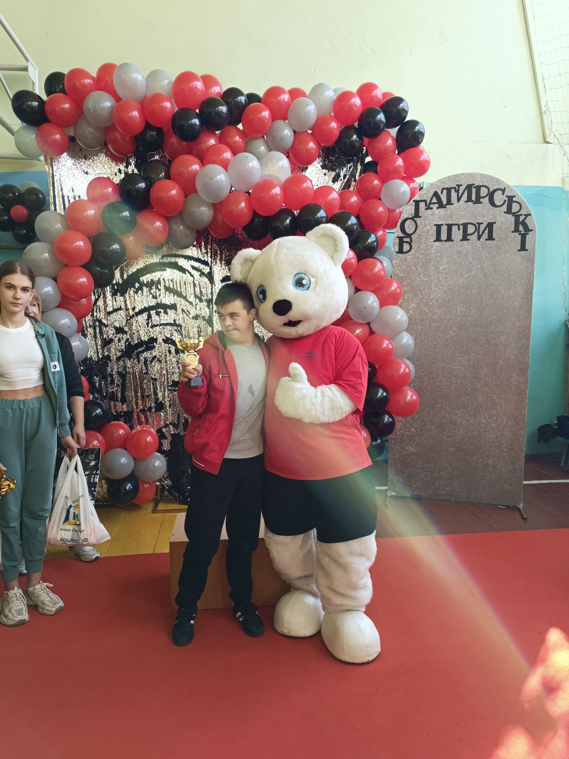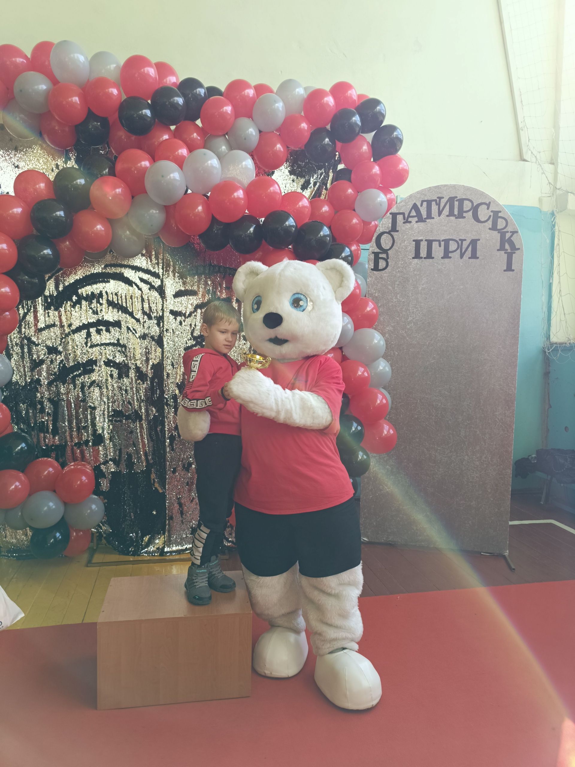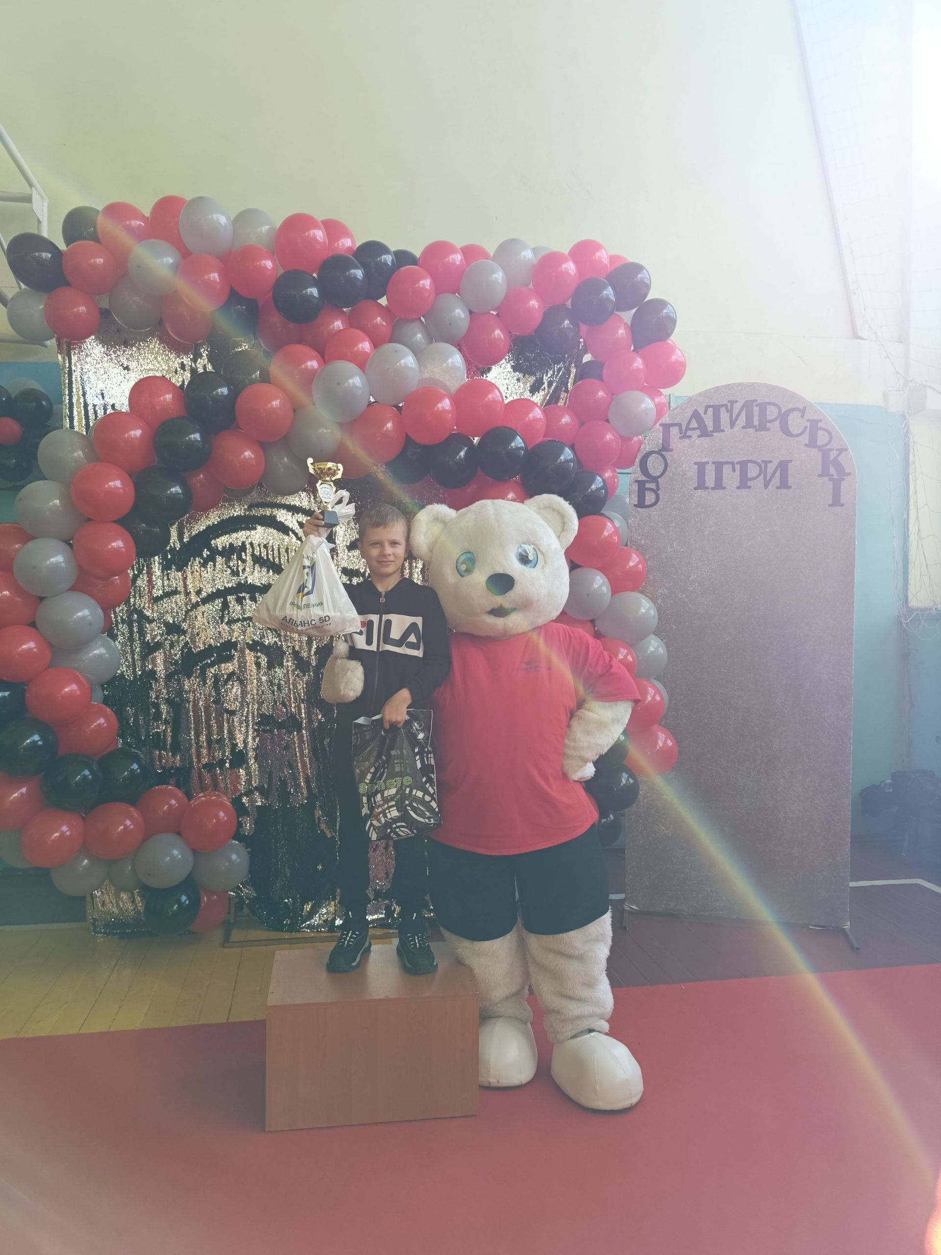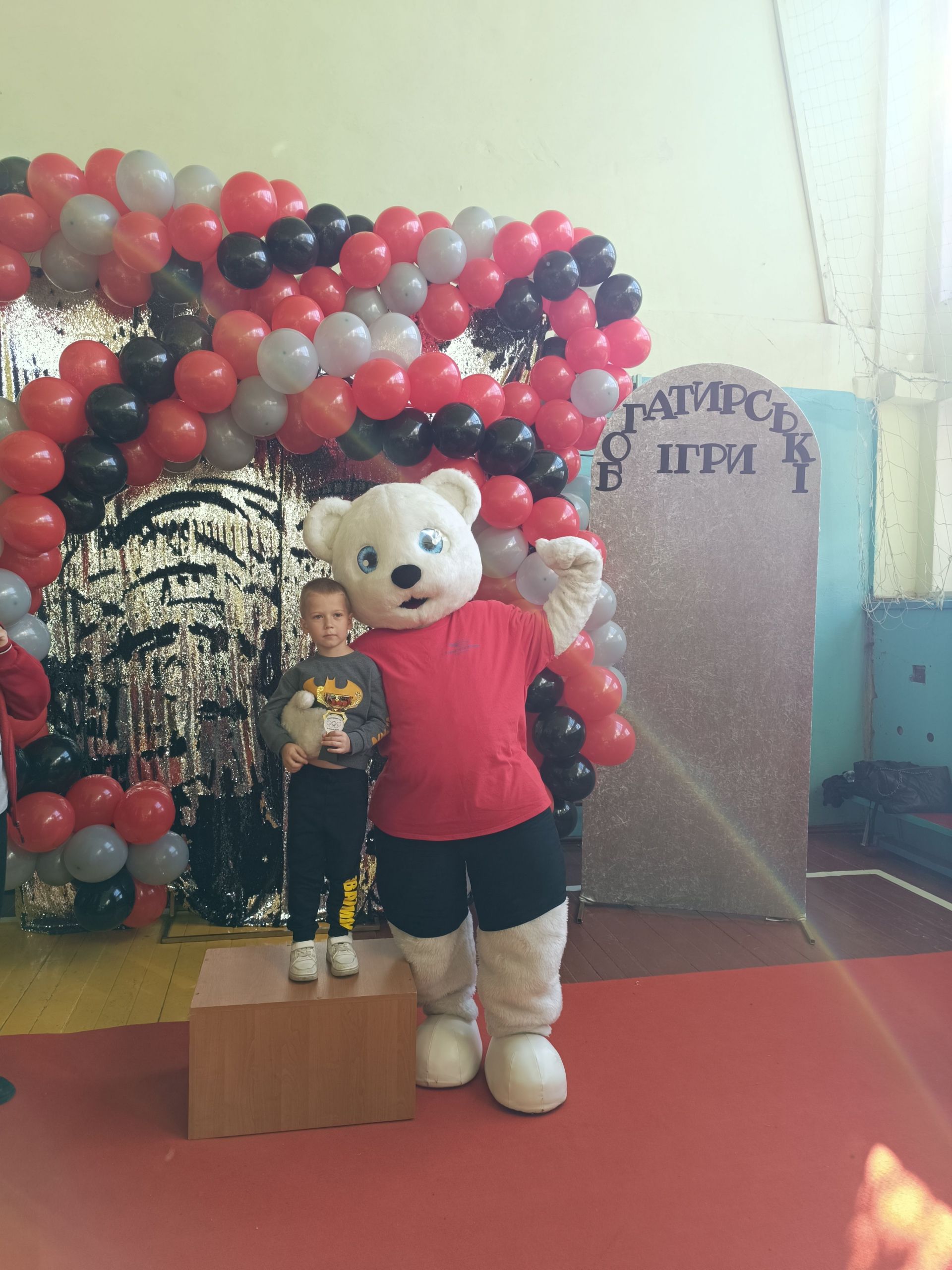 До зали увійшов великий ведмідь, дав дітям п’ять і став поруч із п’єдесталом. Учасники Богатирських ігор отримували призи і фотографувалися із ведмедиком.