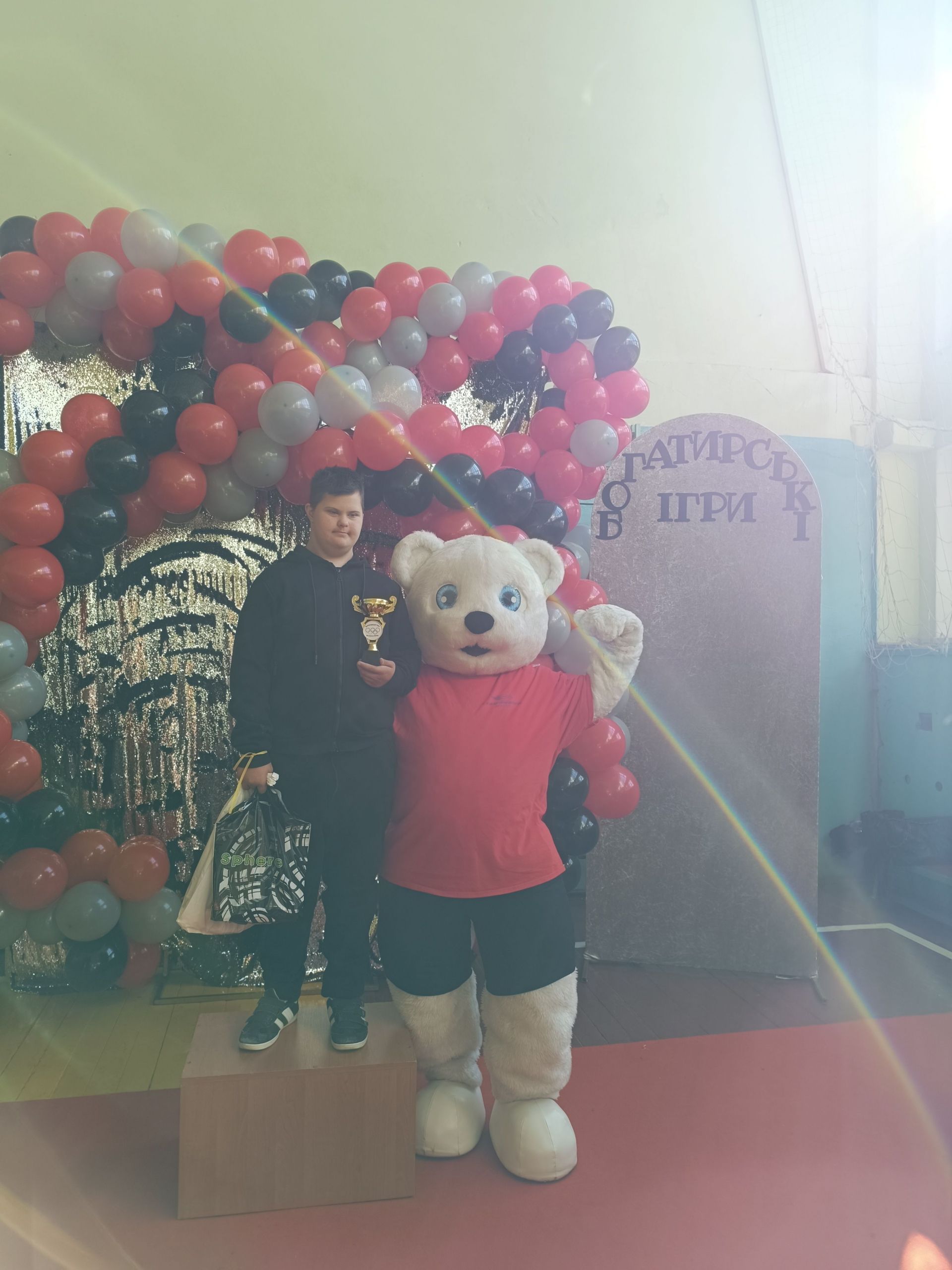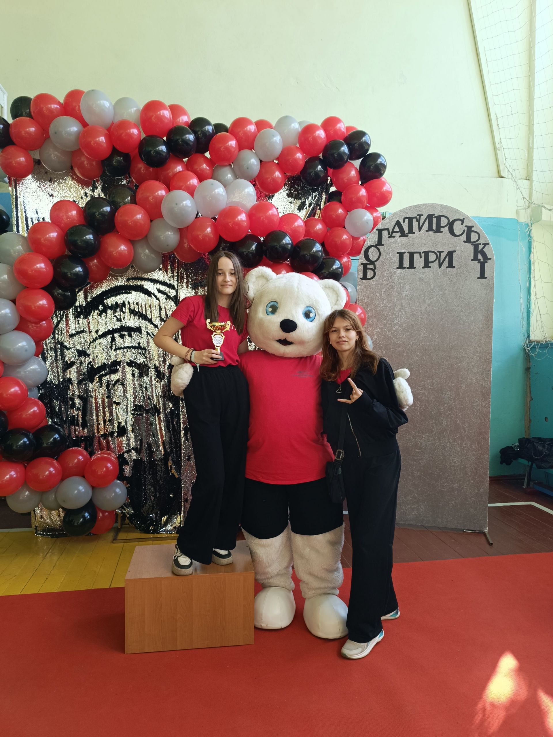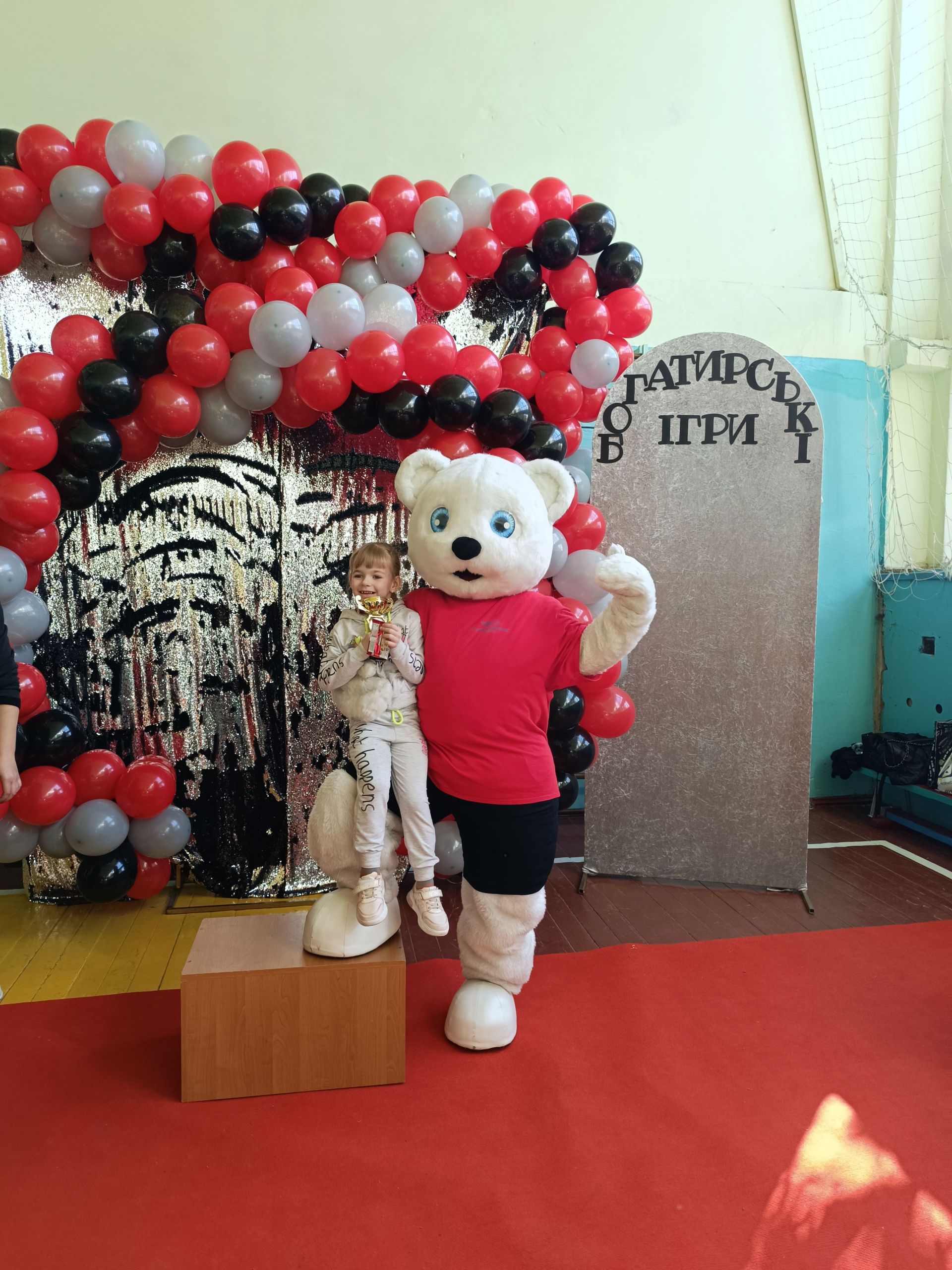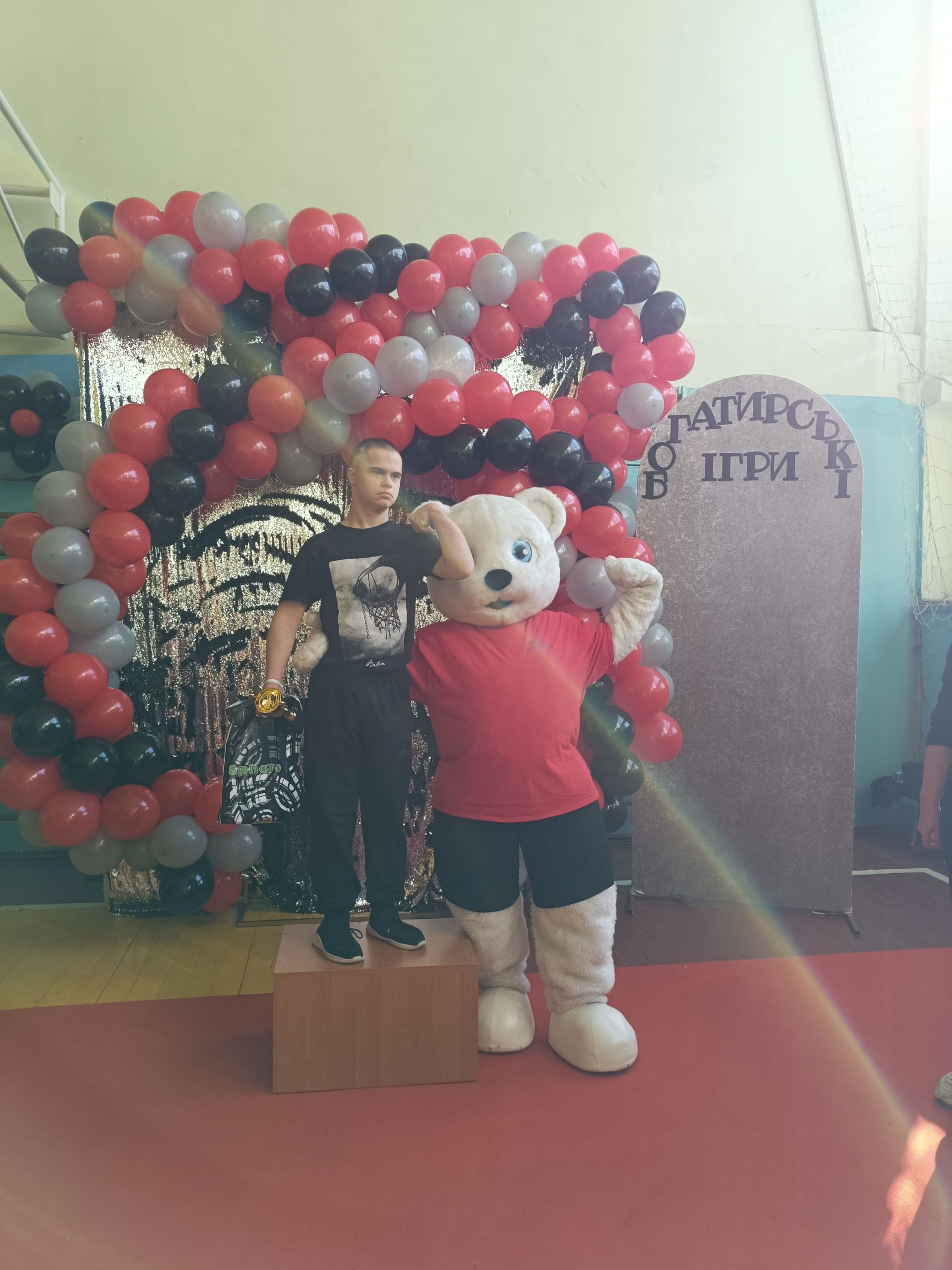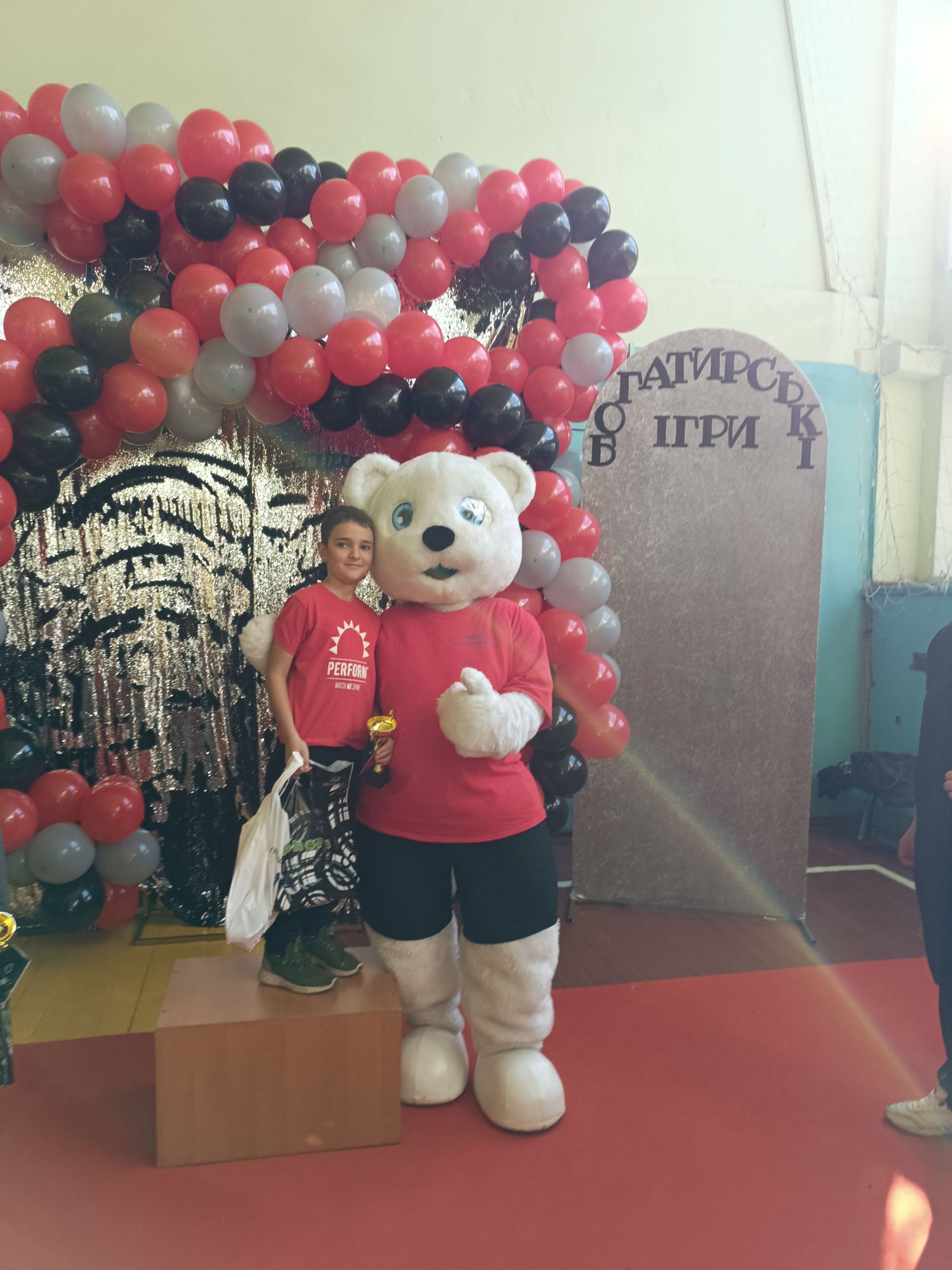 До зали увійшов великий ведмідь, дав дітям п’ять і став поруч із п’єдесталом. Учасники Богатирських ігор отримували призи і фотографувалися із ведмедиком.