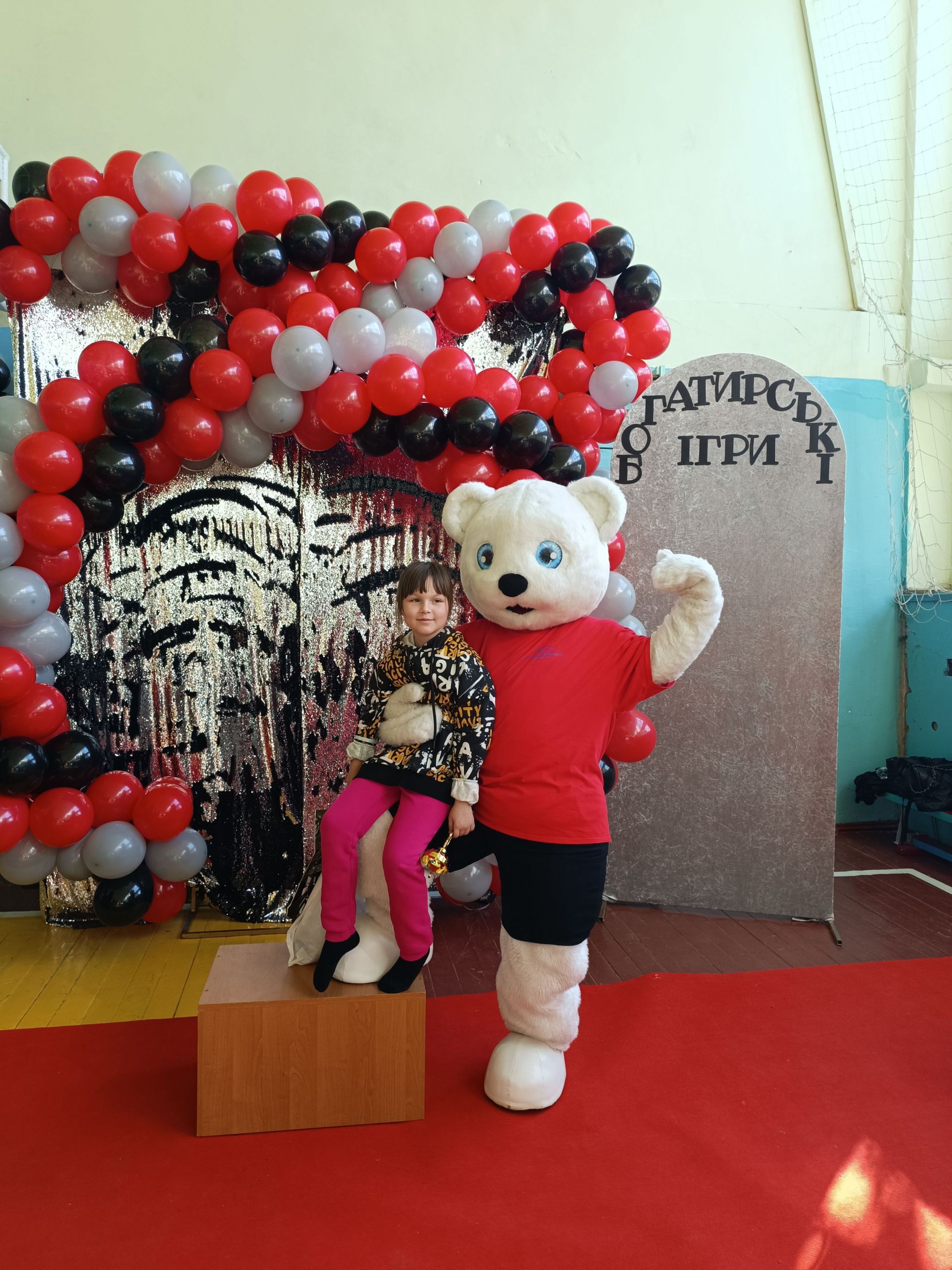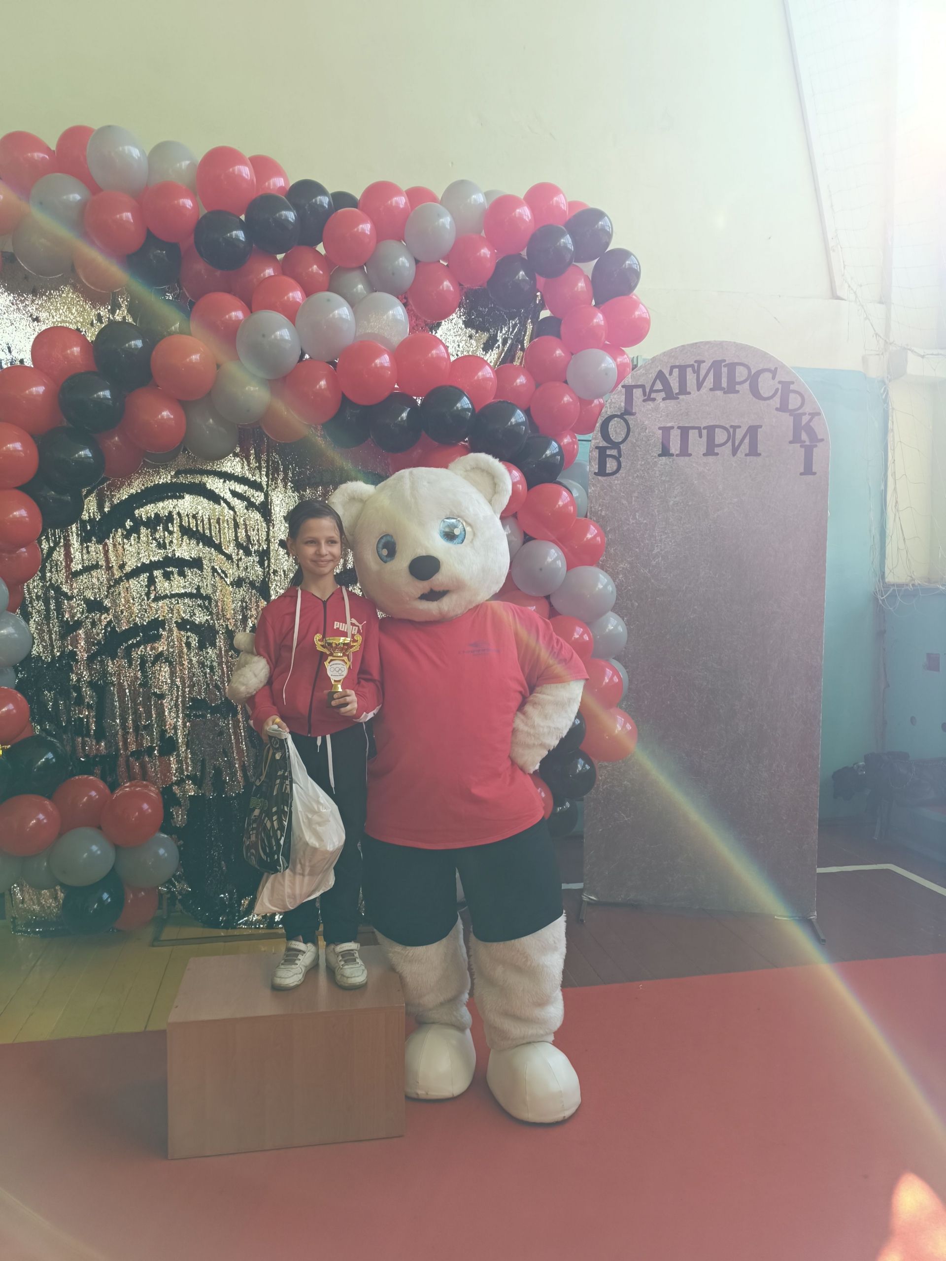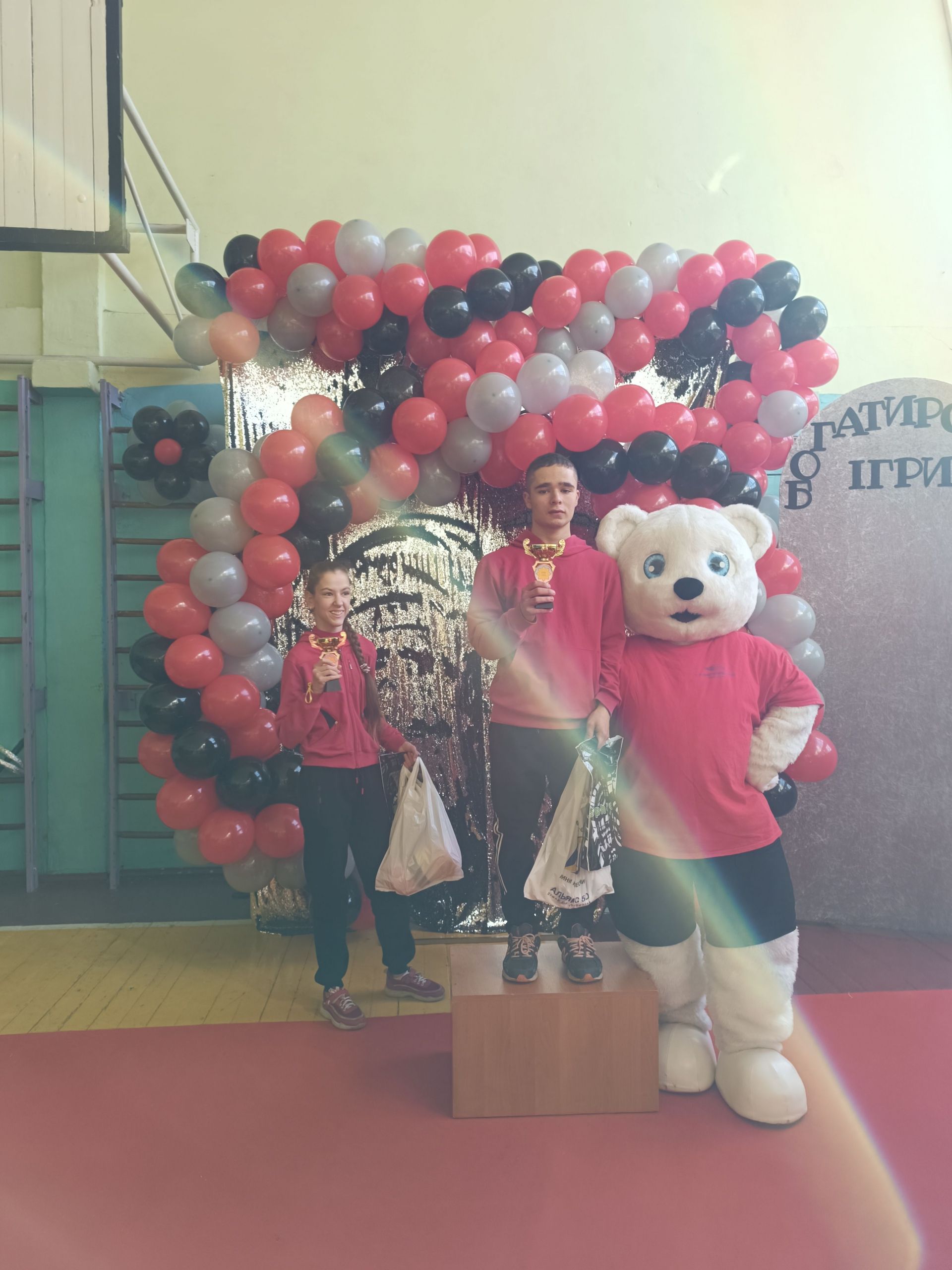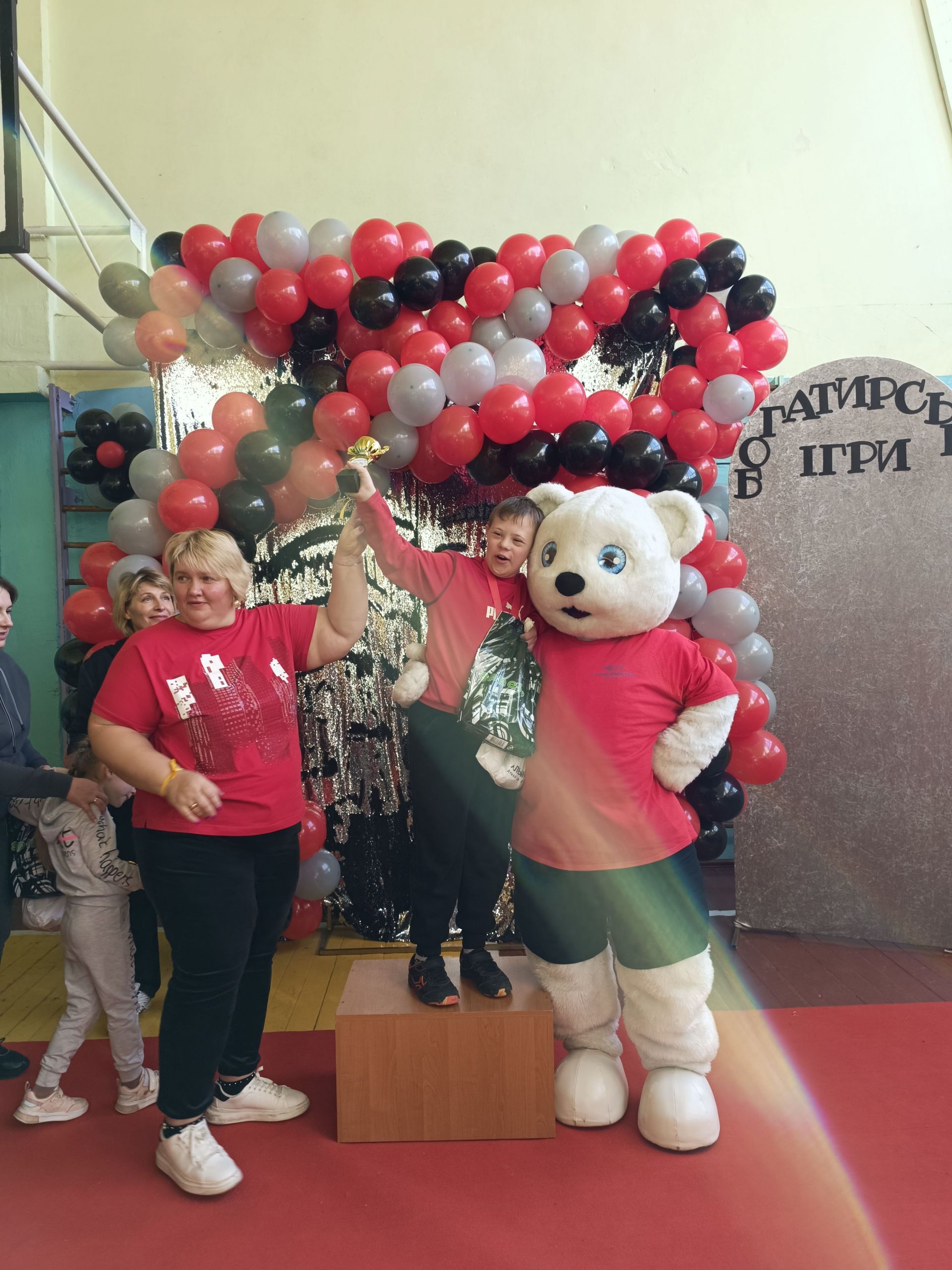До зали увійшов великий ведмідь, дав дітям п’ять і став поруч із п’єдесталом. Учасники Богатирських ігор отримували призи і фотографувалися із ведмедиком.