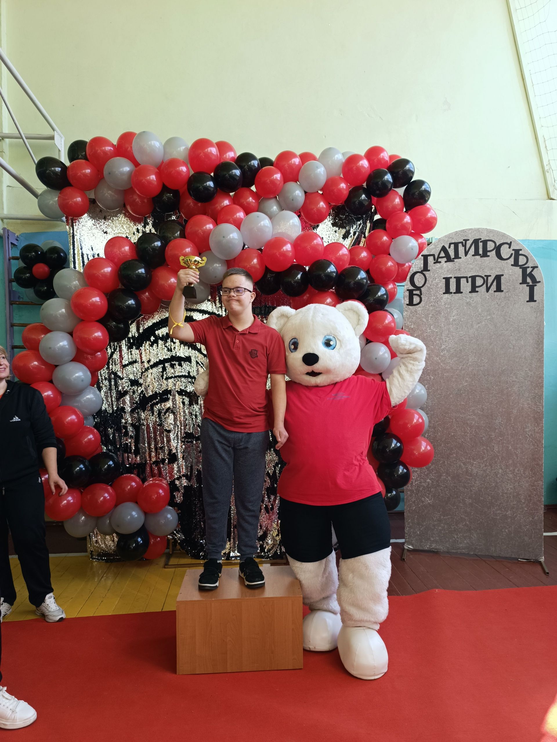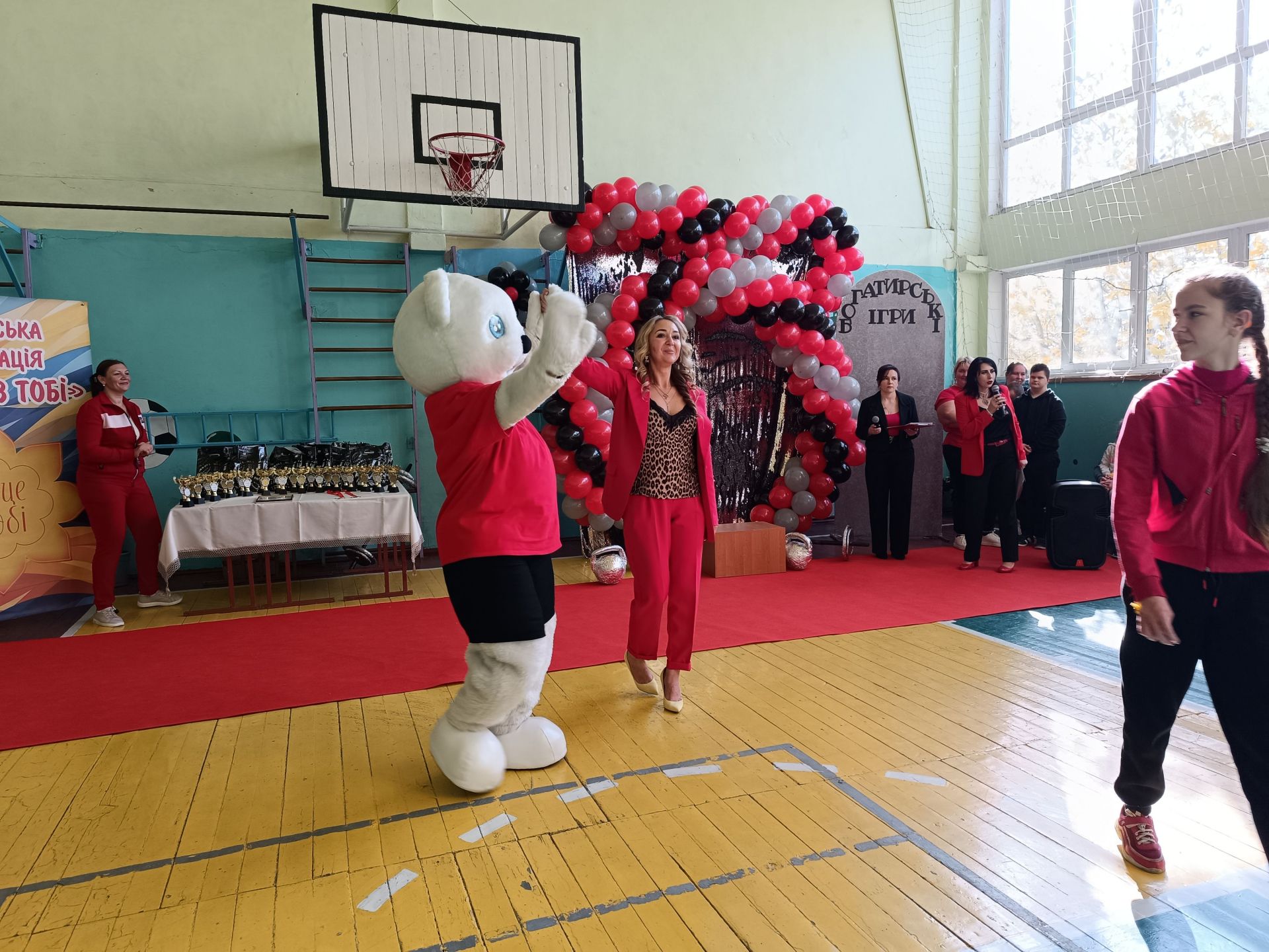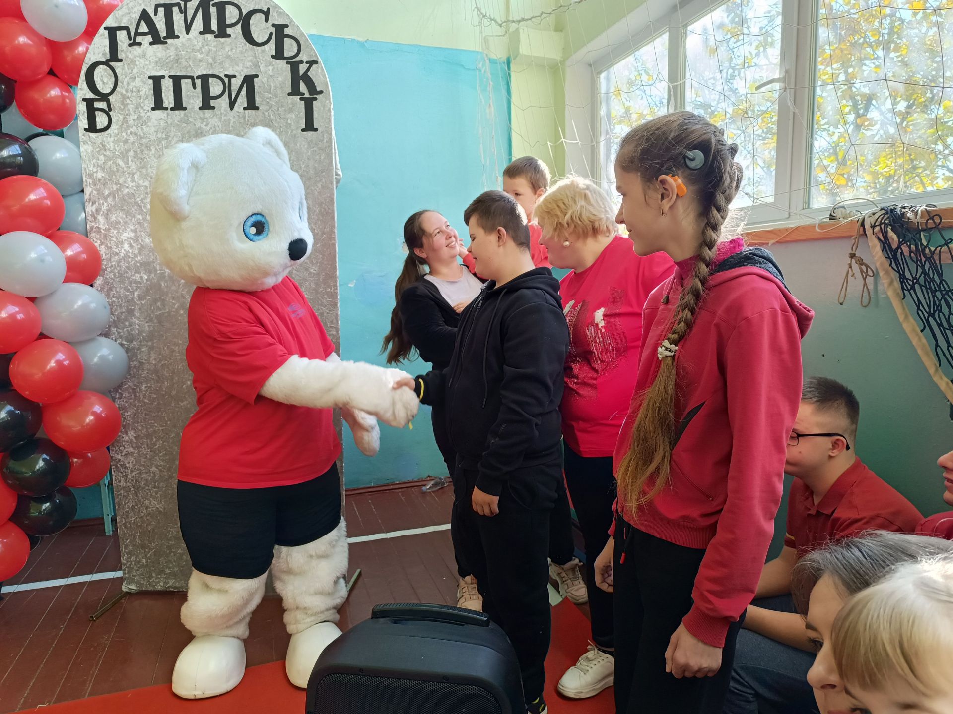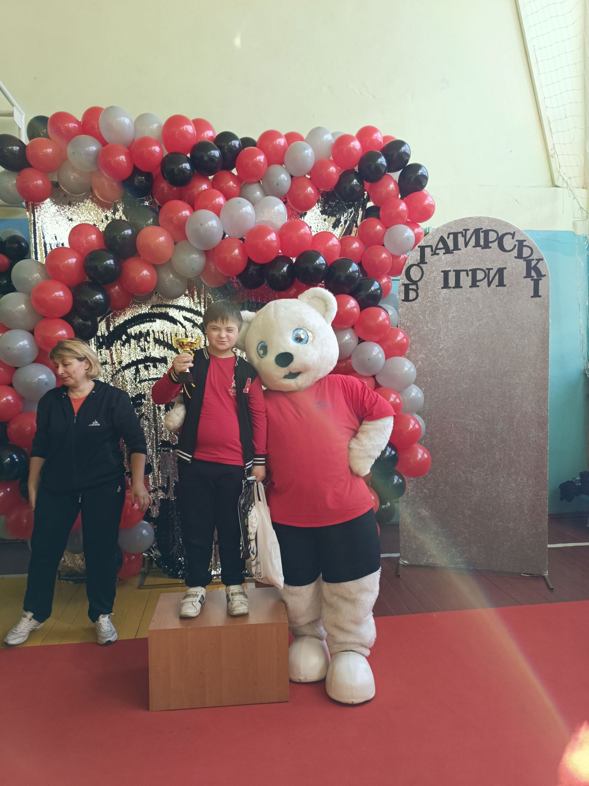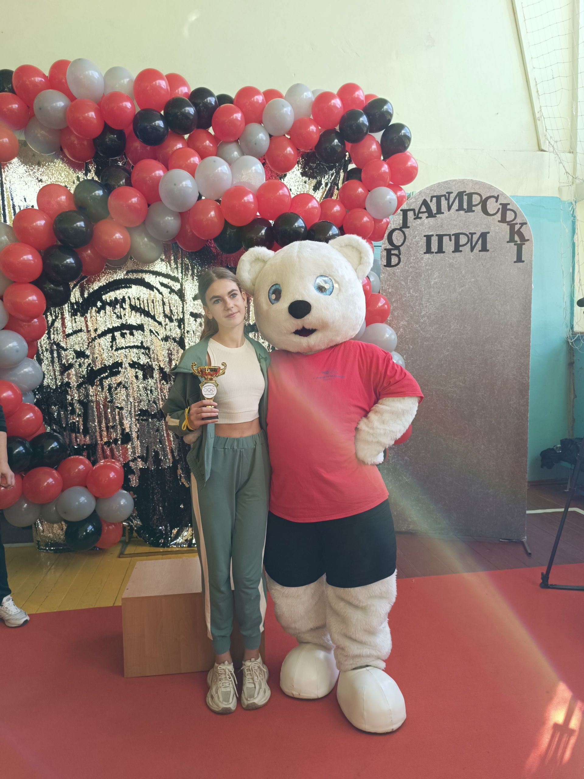 До зали увійшов великий ведмідь, дав дітям п’ять і став поруч із п’єдесталом. Учасники Богатирських ігор отримували призи і фотографувалися із ведмедиком.