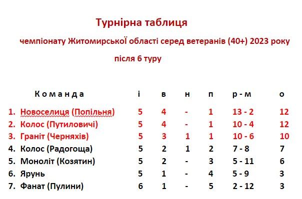 Що до інших ігор туру, то всі вони пройшли в запеклій боротьбі і вплинули на розподіл місць в турнірній таблиці. «Колос» після перемоги в 6--у турі з «Монолітом» помінялися місцями. «Новоселиця» пропускала гру шостого туру і цим скористався «Колос» з Путиловичів. Зараз після 5-ти проведених ігор в турнірній таблиці двовладдя В обох команд по 12 очок На третьому місці «Граніт» Черняхів. «Моноліт» перемістився з 4-го на 5-те місце 6-те-7-ме місце ділять «Ярунь» Звягель та «Фанат» Пулини