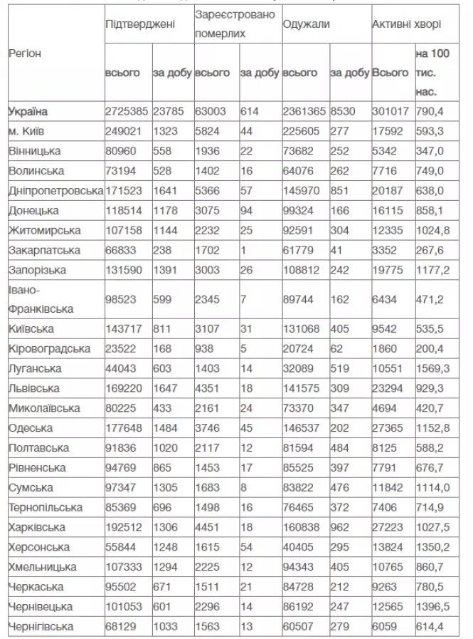 Загалом з початку пандемії в Україні на коронавірус захворіли 2725385 людей, 63003 з них померли
