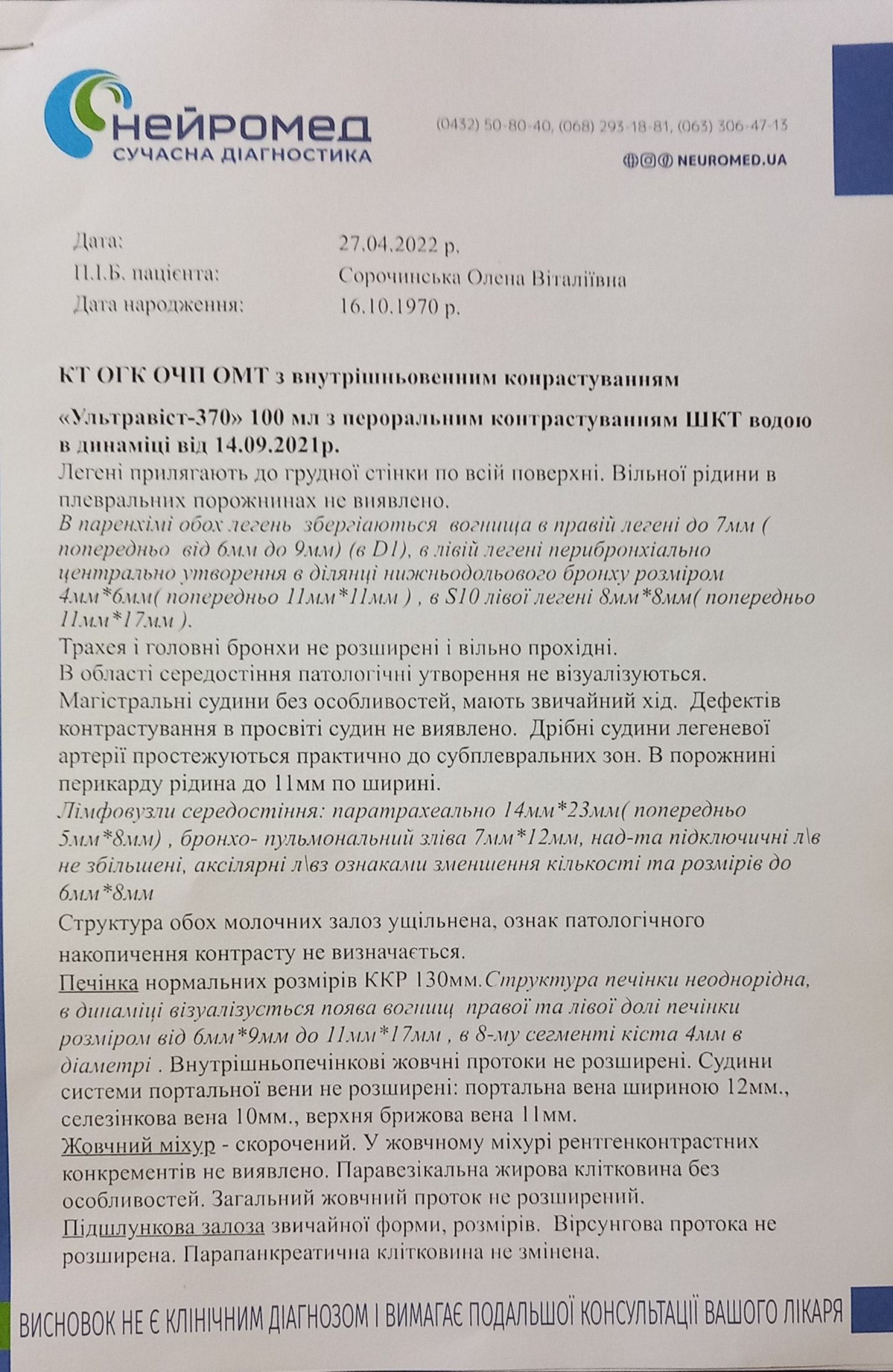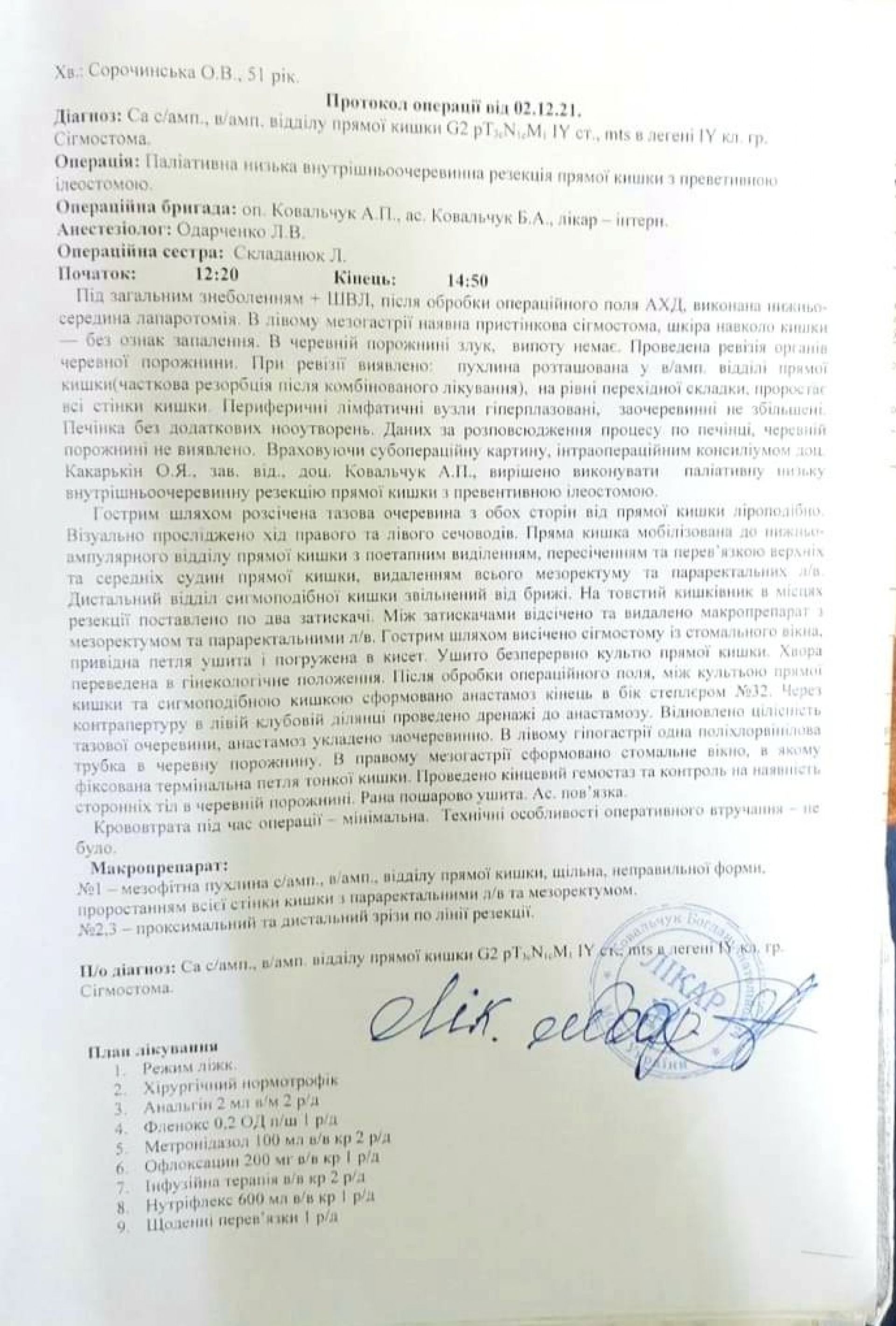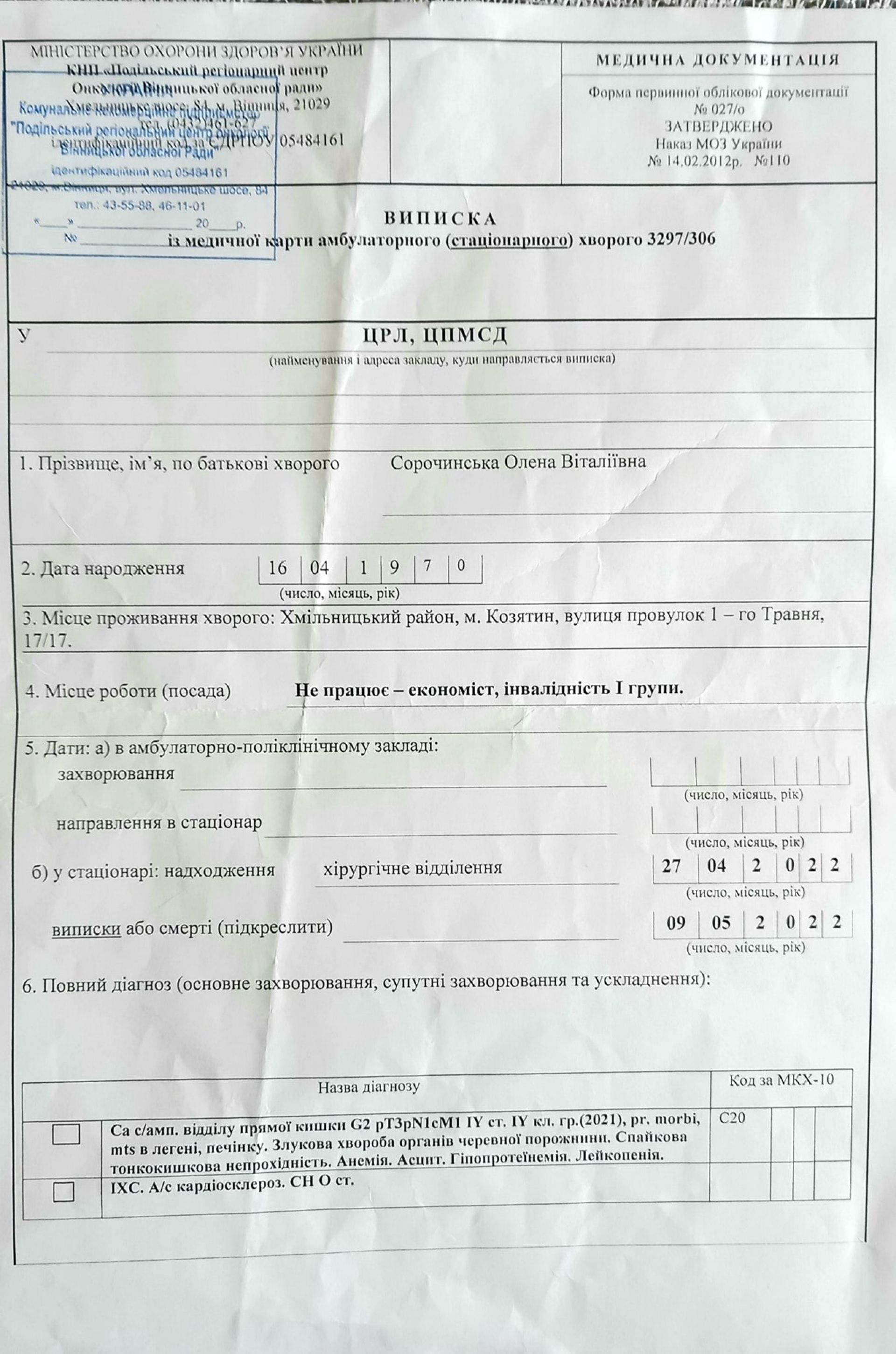 — Любі друзі, допоможіть врятувати життя нашої мами! Моїй мамі Сорочинській Олені Віталіївні, 1970 р.н поставили діагноз РАК ПРЯМОЇ КИШКИ 4 стадія, з метастазами в легені та печінку. Ми лікуємось з 28.02.2021 року , вже було 3 операції які мама перенесла дуже важко, також проходили курси хіміотерапії та променевої терапії але і це не допомогло, — пише у ФБ донька Олени Тина Бойко