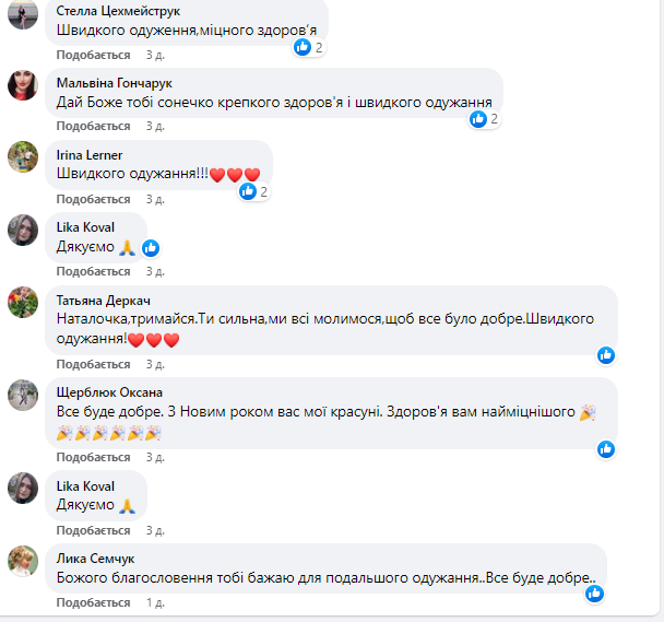 — Доброго дня всім небайдужим до нашого горя! Прийшов час зробити новий допис, так як багато з Вас цікавиться здоров'ям Наталочка кожен день. За час перебування в лікарні вона пережила два рази критичний стан, життя було її на волосині,якщо не сказати більше. Але завдячуючи лікарям, вдалося повернути її до стабільного, але, на жаль, важкого стану, — написала Lika Koval