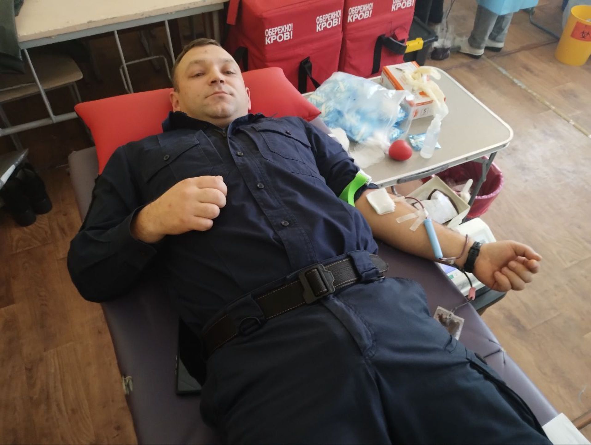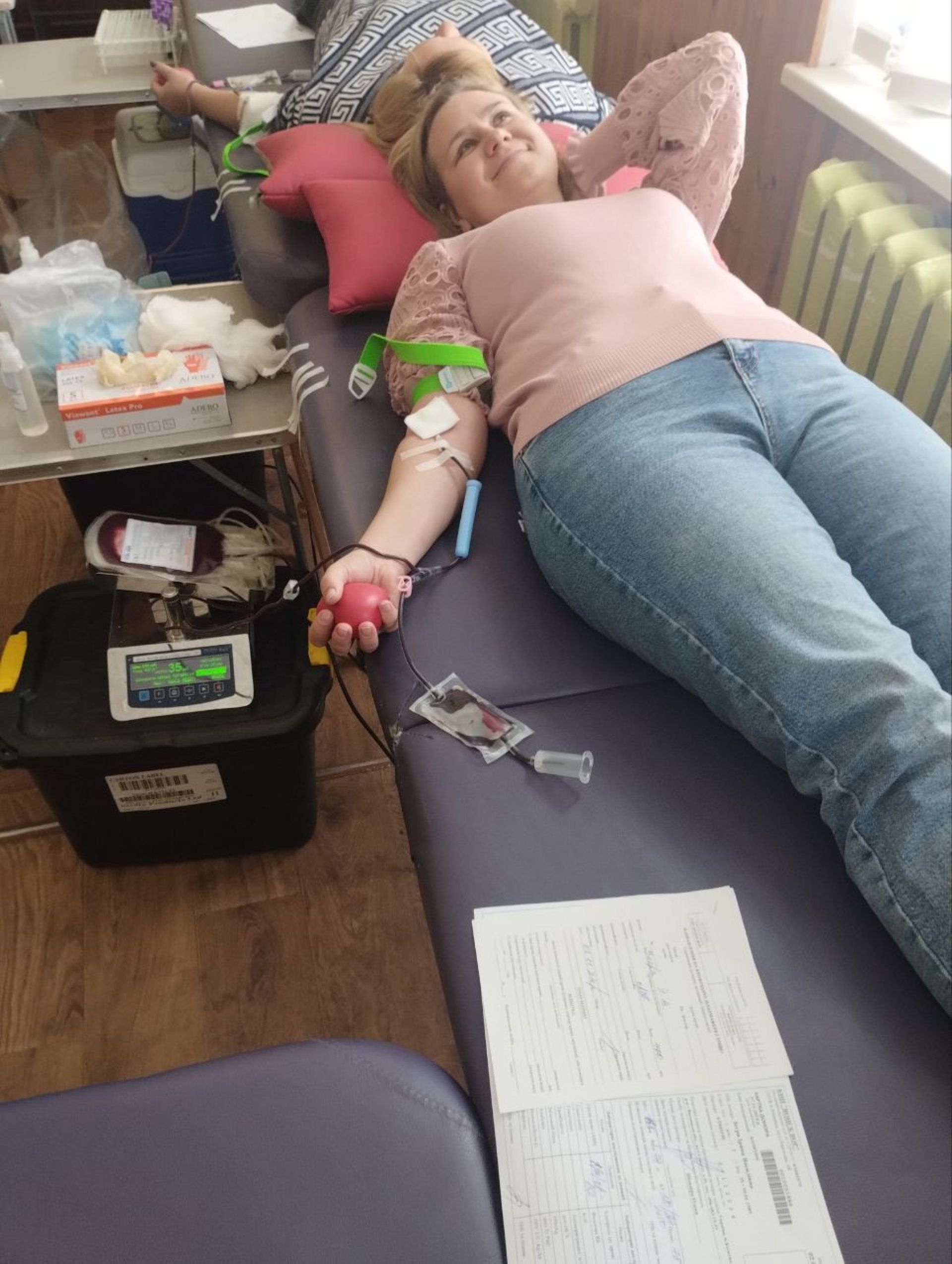 Далі огляд лікаря і якщо все добре — видають контейнер для крові і донор прямує безпосередньо у кімнату здачі крові. Скрізь працювала виїзна бригада Вінницького обласного центру крові. А безпосереднього забір крові робили дві операційних медсестри.
