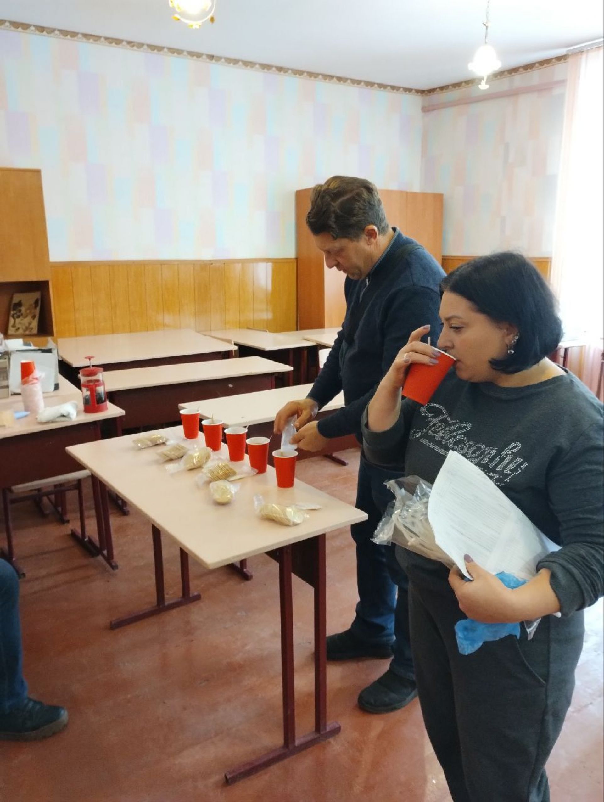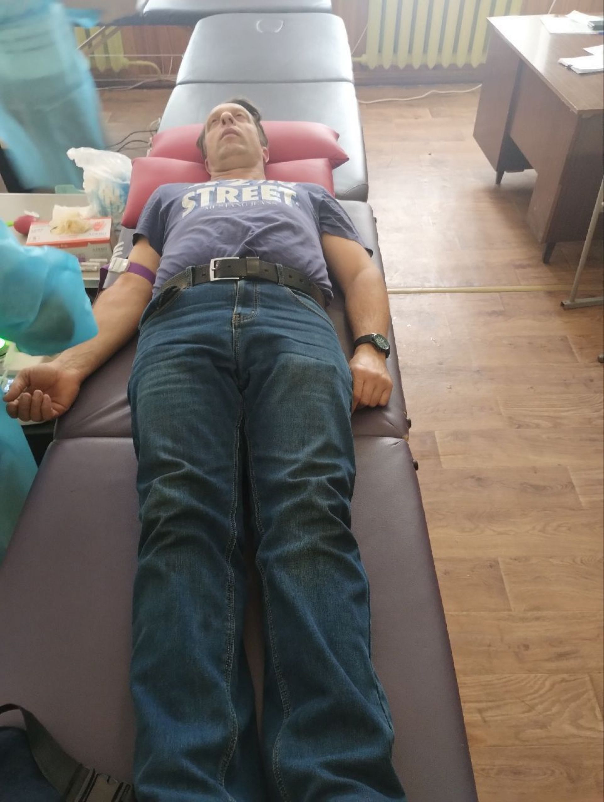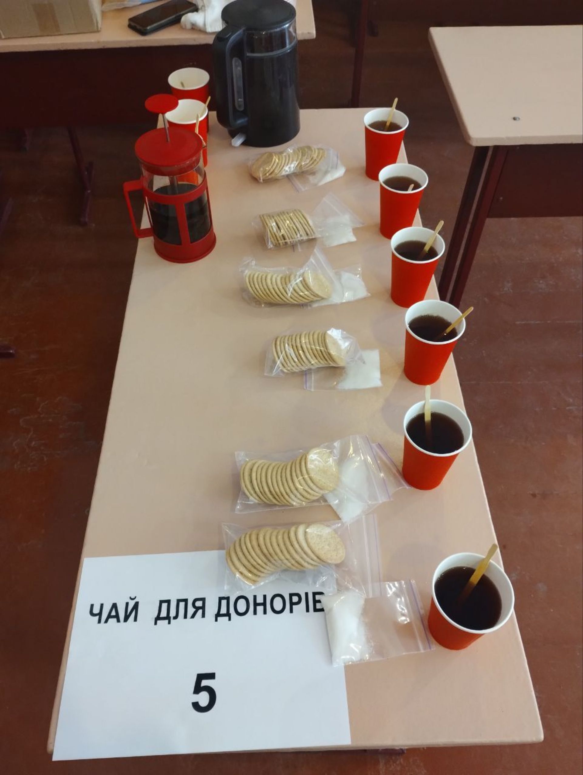 Перед тим, як здати кров спочатку потрібно було зареєструватися у відповідно облаштованому під це кабінеті. Його на момент акції назвали реєстратурою. Тут же був облаштований стіл, де донорів пригощали теплим чаєм з цукром та галетним печивом. Така процедура.