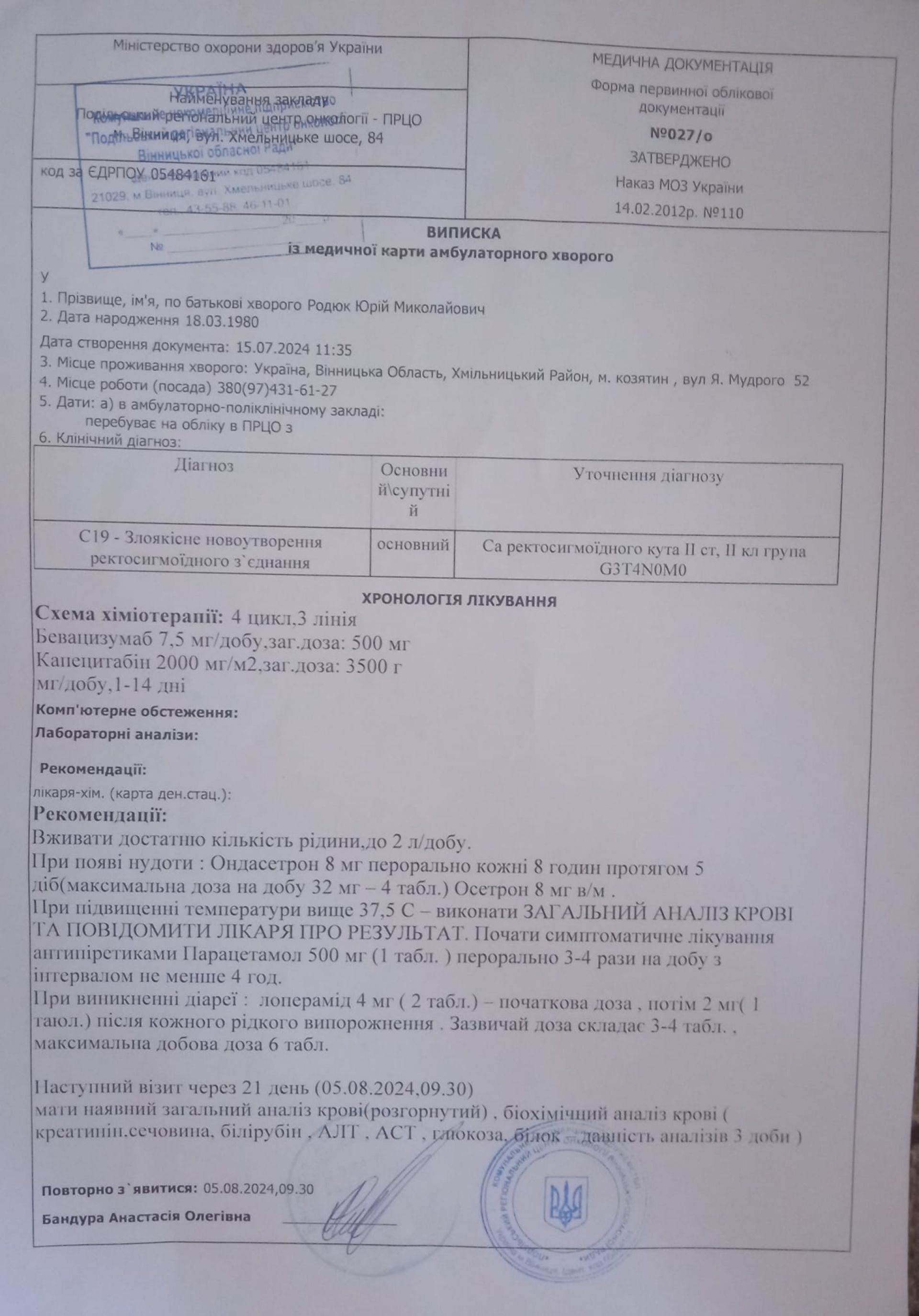 - Козятинчанин Юрій Родюк веде боротьбу я з аденокарциномою товстої кишки.