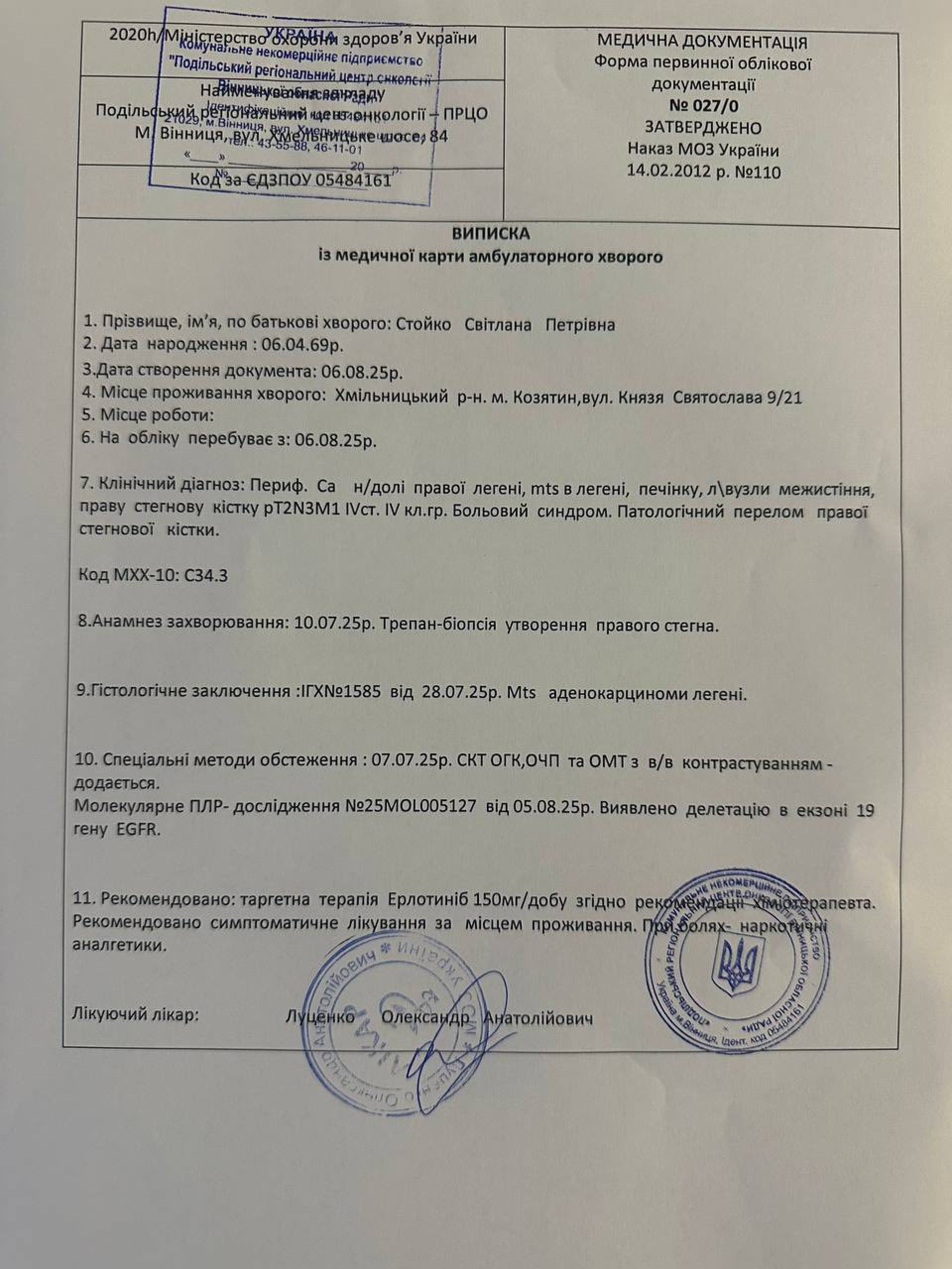 — Ніколи не думала, що доведеться писати такий пост… Моя мама, Світлана Стойко Svetlana Stoyko, зараз бореться з дуже важким діагнозом — рак легені з метастазами (аденокарцинома). Хвороба вразила легені, печінку, лімфовузли та кістку. Нещодавно стався страшний момент — через ураження кістки метастазами в мами трапився патологічний перелом стегна. Зараз вона прикута до ліжка і відчуває сильний біль… — пише Вероніка