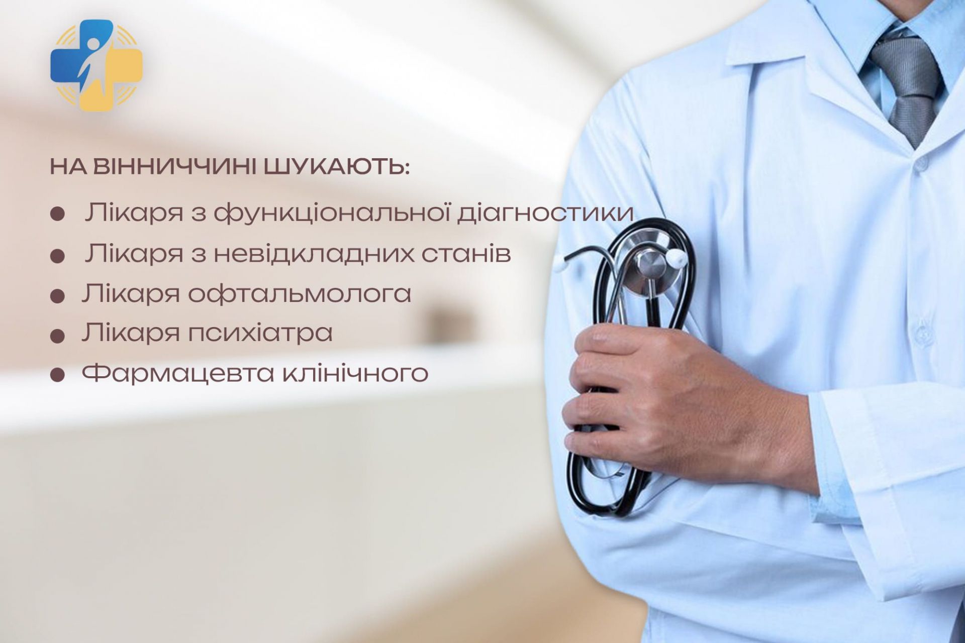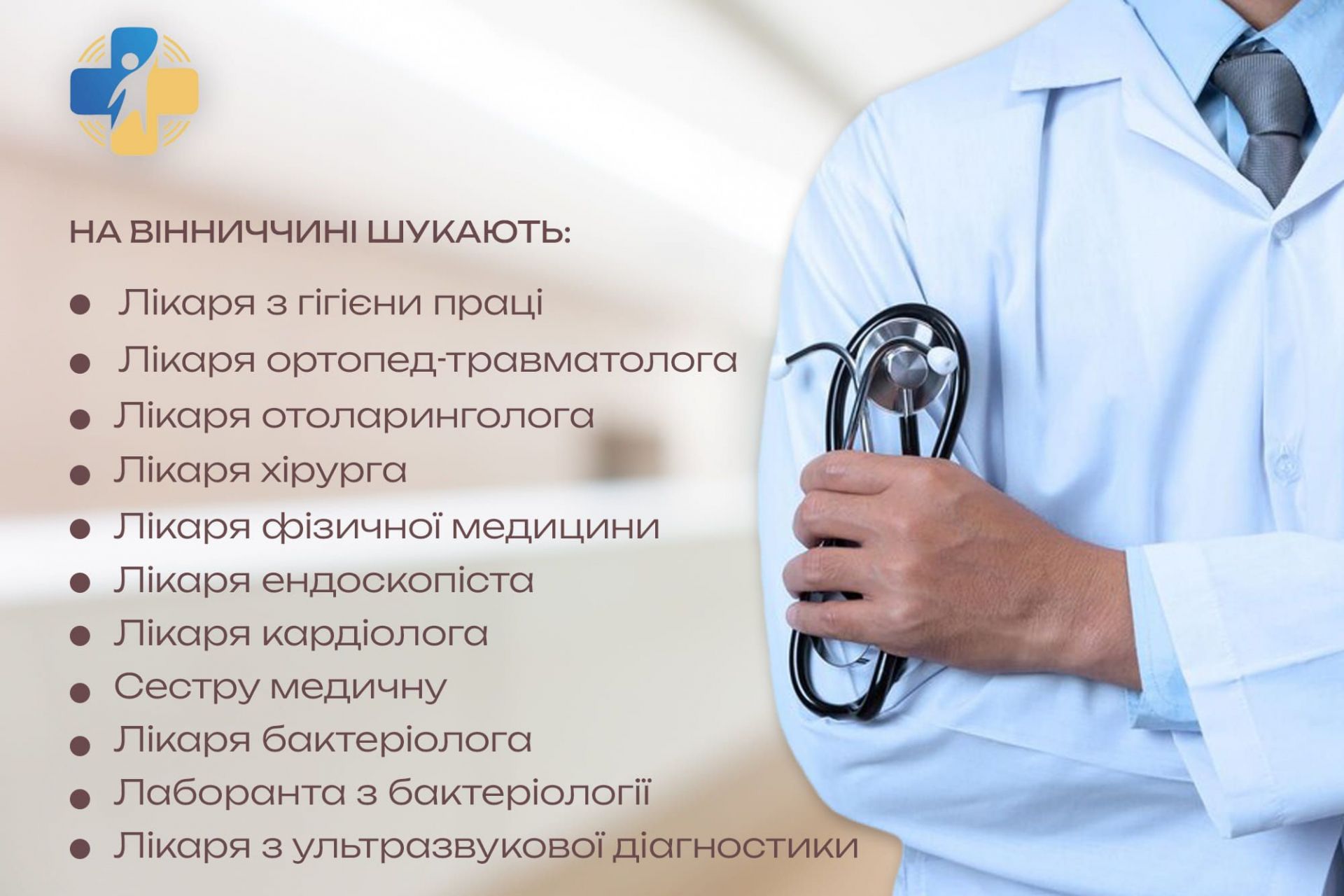 - У Вінницькій області медичні заклади на постійну роботу шукають лікарів, зокрема, офтальмолога, хірурга, ендоскопіста, кардіолога та інших фахівців.
