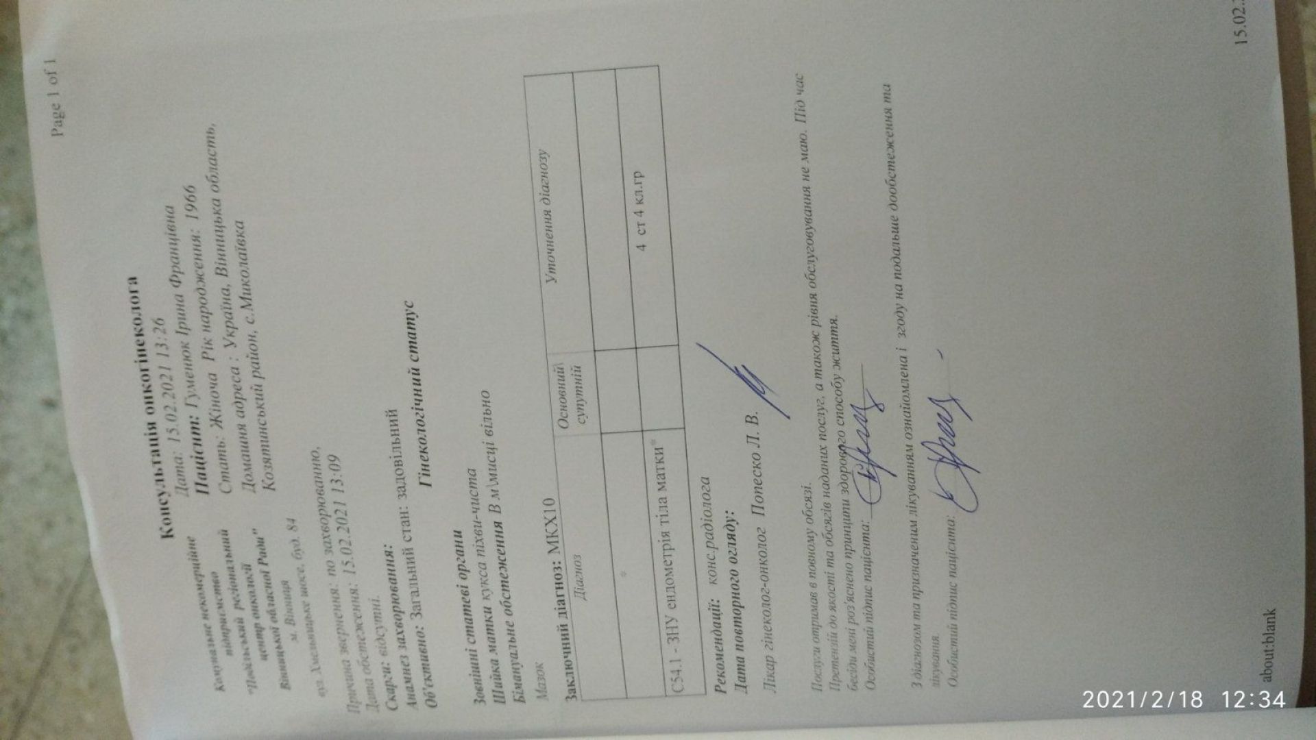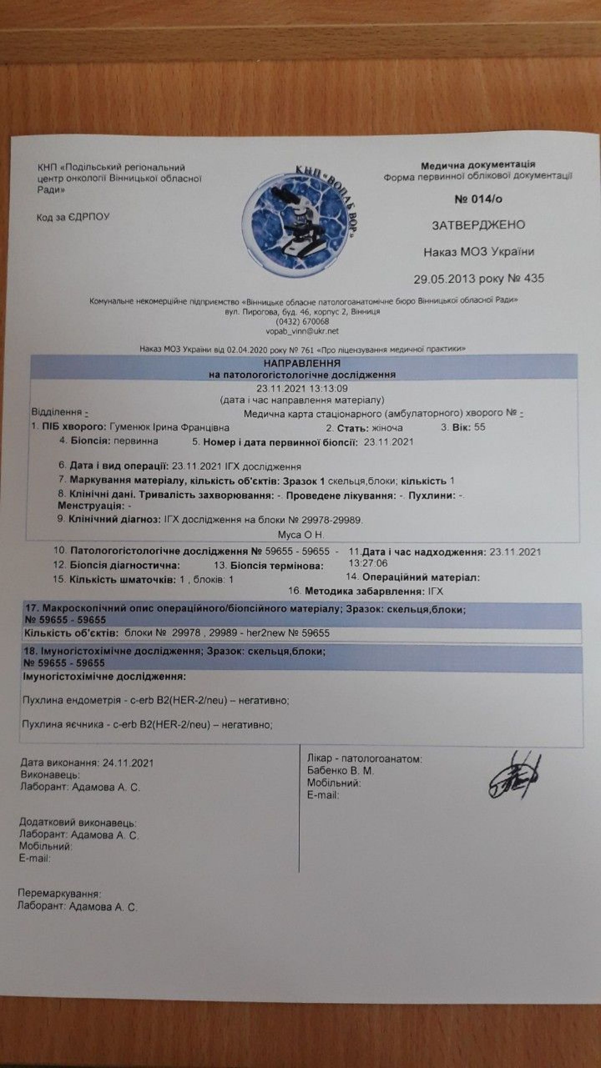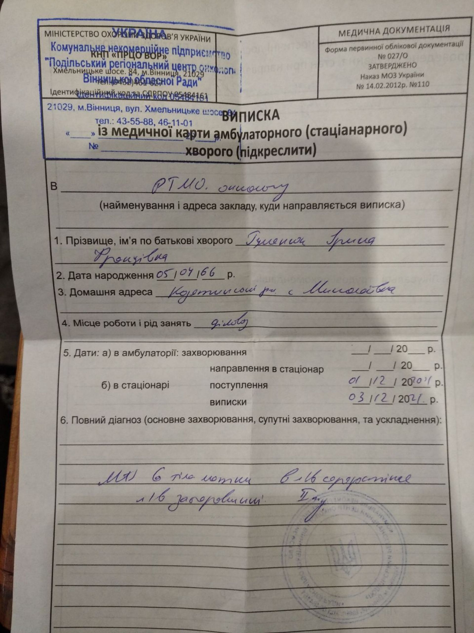 – У моєї мами, 55-річної Ірини Гуменюк, рак 4-го ступеню жіночих органів. Ми рік тому пройшли повний курс лікування. Через півроку почався рецидив. Знову потрібні гроші на лікування. Заробляю на роботі лише я одна, а живемо втрьох: я, мама і моя донька. Всі документи по захворюванню мами надаю, – каже дочка Ірини. – Ми звертаємось до всіх небайдужих з добрими серцями людей, тому що ваша підтримка, це наша остання надія. Кажуть, Бог допомагає руками людей. Це дійсно так і ми віримо у Божу і вашу підтримку.