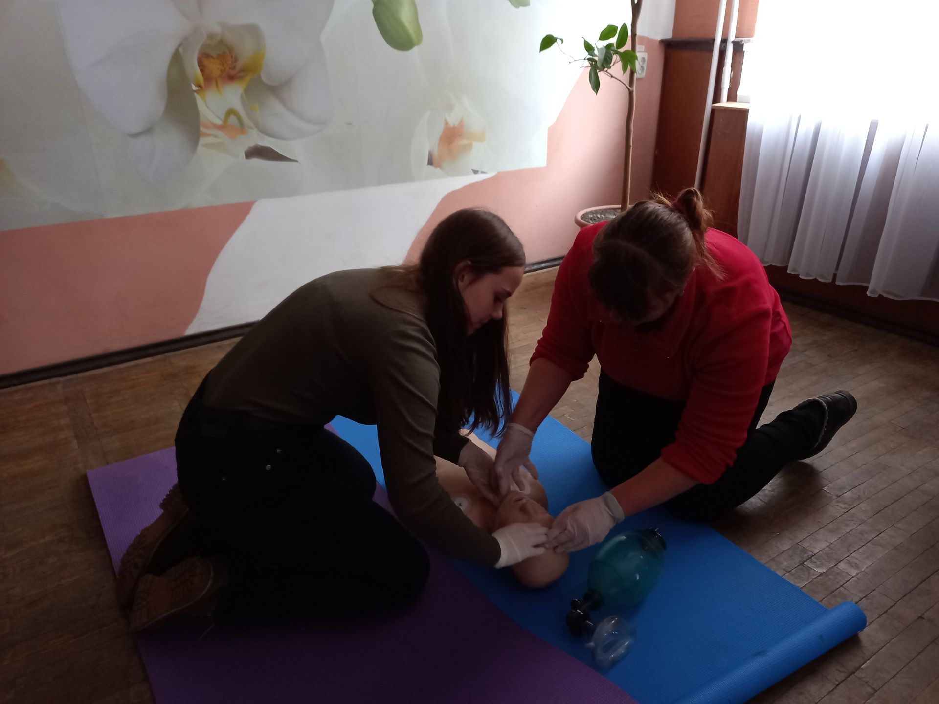 Учасники тренінгу розбиваються на дві групи і пробують застосовувати отримані знання на практиці. Першою до манекена підходить Іванна.