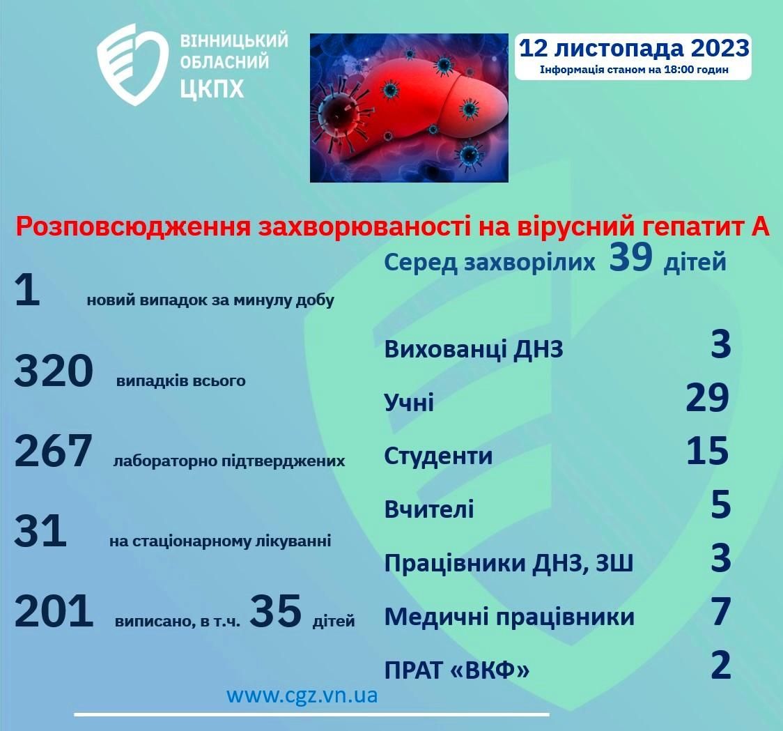 - Станом на 12 листопада у Вінницькій області зафіксували 320 випадків гепатиту А від початку спалаху. За добу виявили одного нового захворілого.