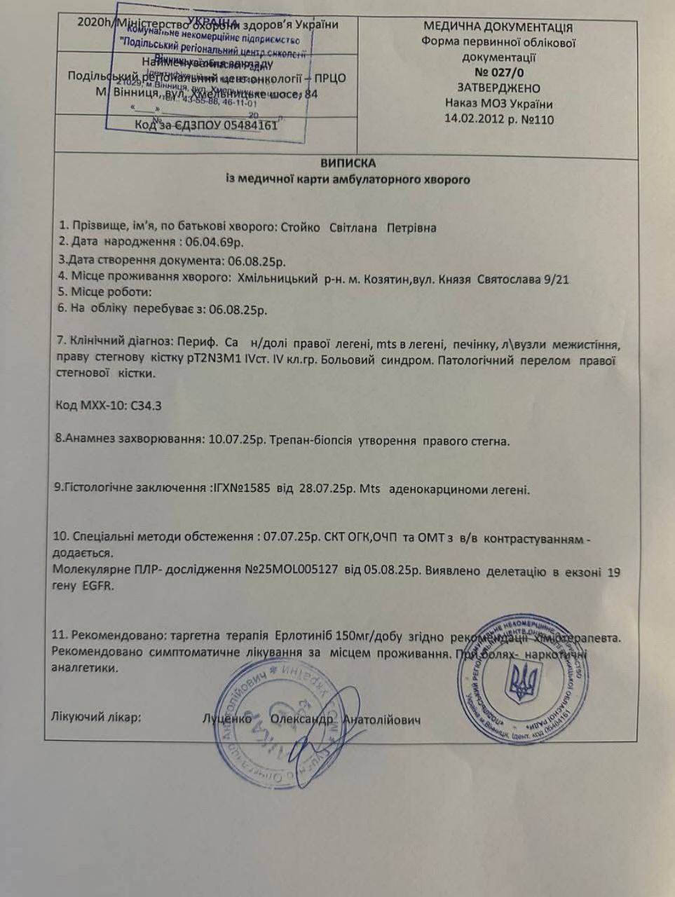 - У жінки — рак легень з метастазами (аденокарцинома). Хвороба вразила легені, печінку, лімфовузли та кістку.