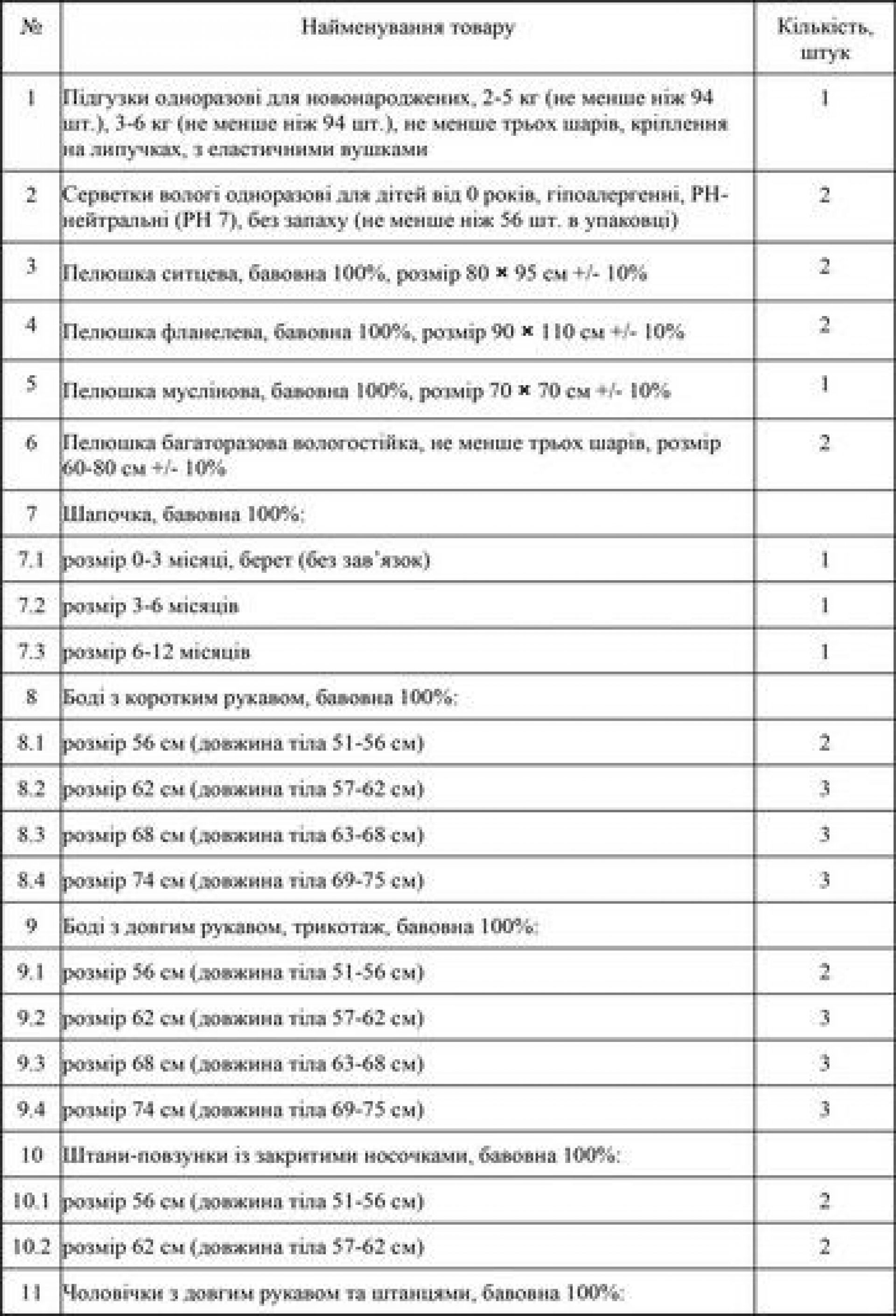 - Підгузки одноразові для новонароджених, 2-5 кг (не менше ніж 47 шт.), 3-6 кг (не менше ніж 47 шт.), не менше трьох шарів, кріплення на липучках, з еластичними вушками,