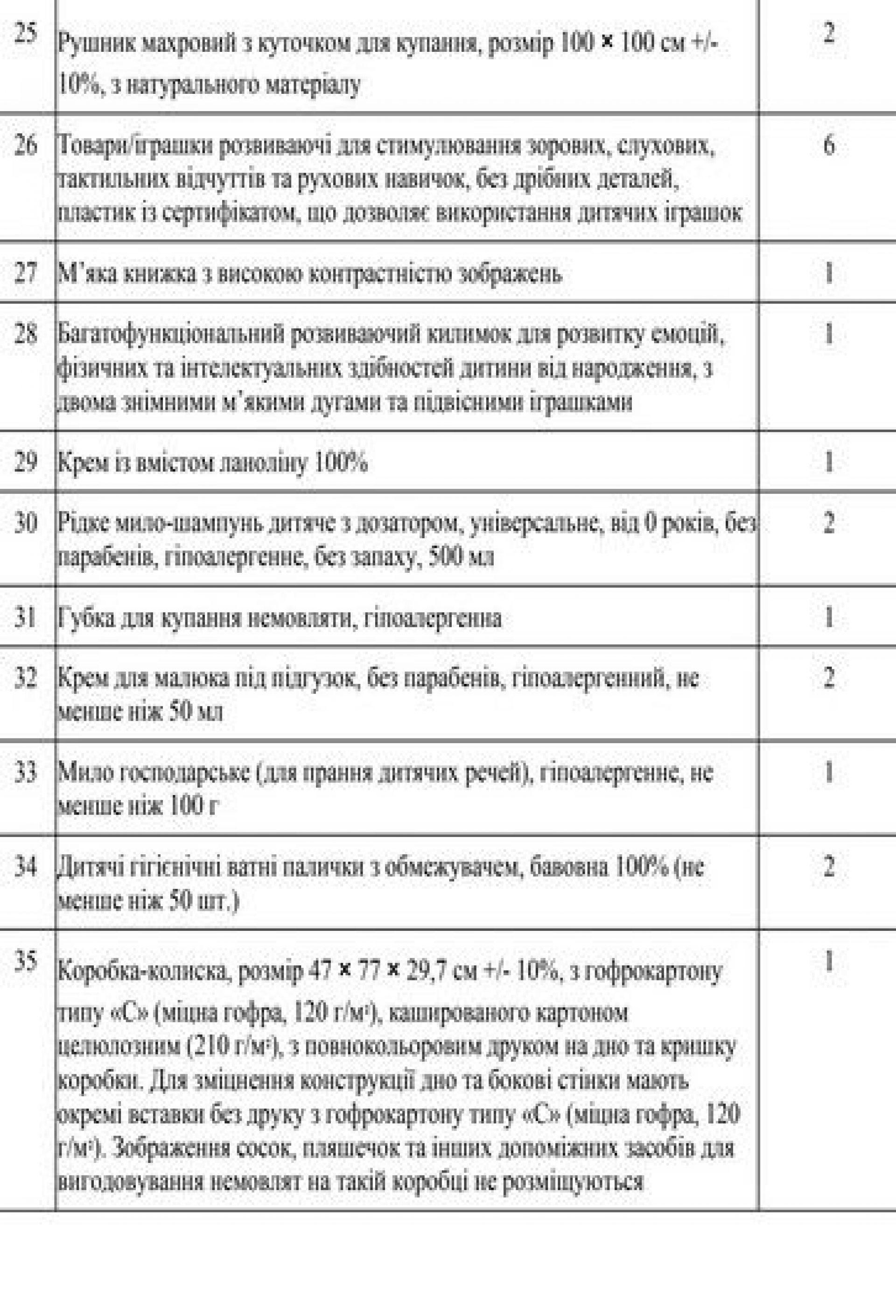 - Коробка-колиска, розмір 43 × 70 × 27 см +/- 10 %, з гофрокартону типу «С» (міцна гофра, 120 г/м-2), кашированого картоном целюлозним (210 г/м-2), та з повнокольоровим друком на дно та кришку коробки. Для зміцнення конструкції дно та бокові стінки мають окремі вставки без друку з гофрокартону типу «С» (міцна гофра, 120 г/м-2). При цьому зображення сосок, пляшечок та інших допоміжних засобів для вигодовування немовлят на такій коробці не розміщуються.