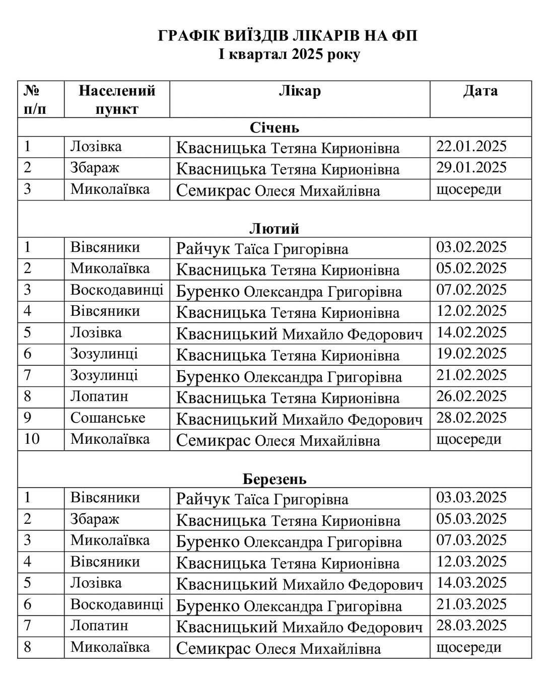 - Опублікували графік виїзду лікарів на 1 квартал 2025 року