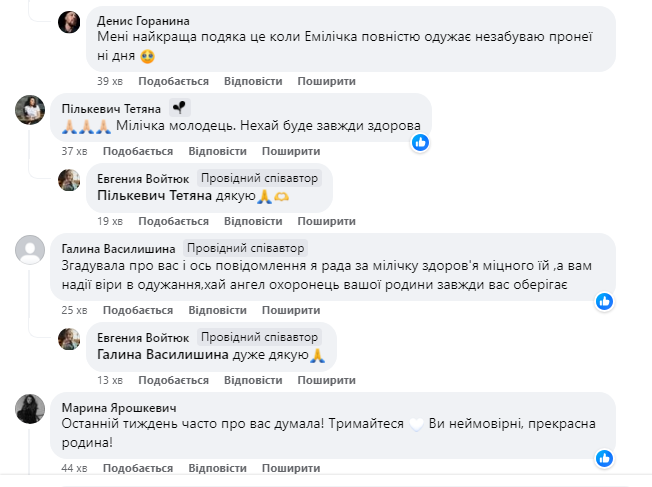 — Ми безмежно раді! Вже налаштувалися на другий етап боротьби з хворобою та підготували Емілію! Але ми вірили до останнього, що все буде добре (хоча % були малі в даному випадку, бо пройшли дві перевірки), і підготувались до гіршого розвитку подій. Але Господь розпорядився по іншому Дякувати Богу що все добре. Ми чекаємо завершення підтримуючої хіміотерапії (яка має завершитися в грудні місяці) та операції на ніжці Емілії. Дякуємо кожному з Вас за підтримку та молитви нашої родини! — підсумували у дописі.