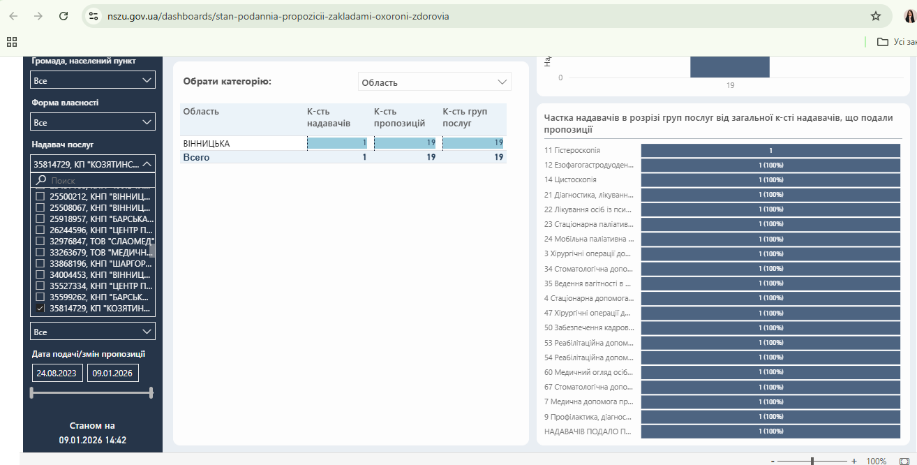 Такі дані наводить аналітична панель «Стан подання пропозицій закладами охорони здоров’я на укладення договорів з НСЗУ за програмою медичних гарантій» на офіційному порталі Національної служби здоров’я України.