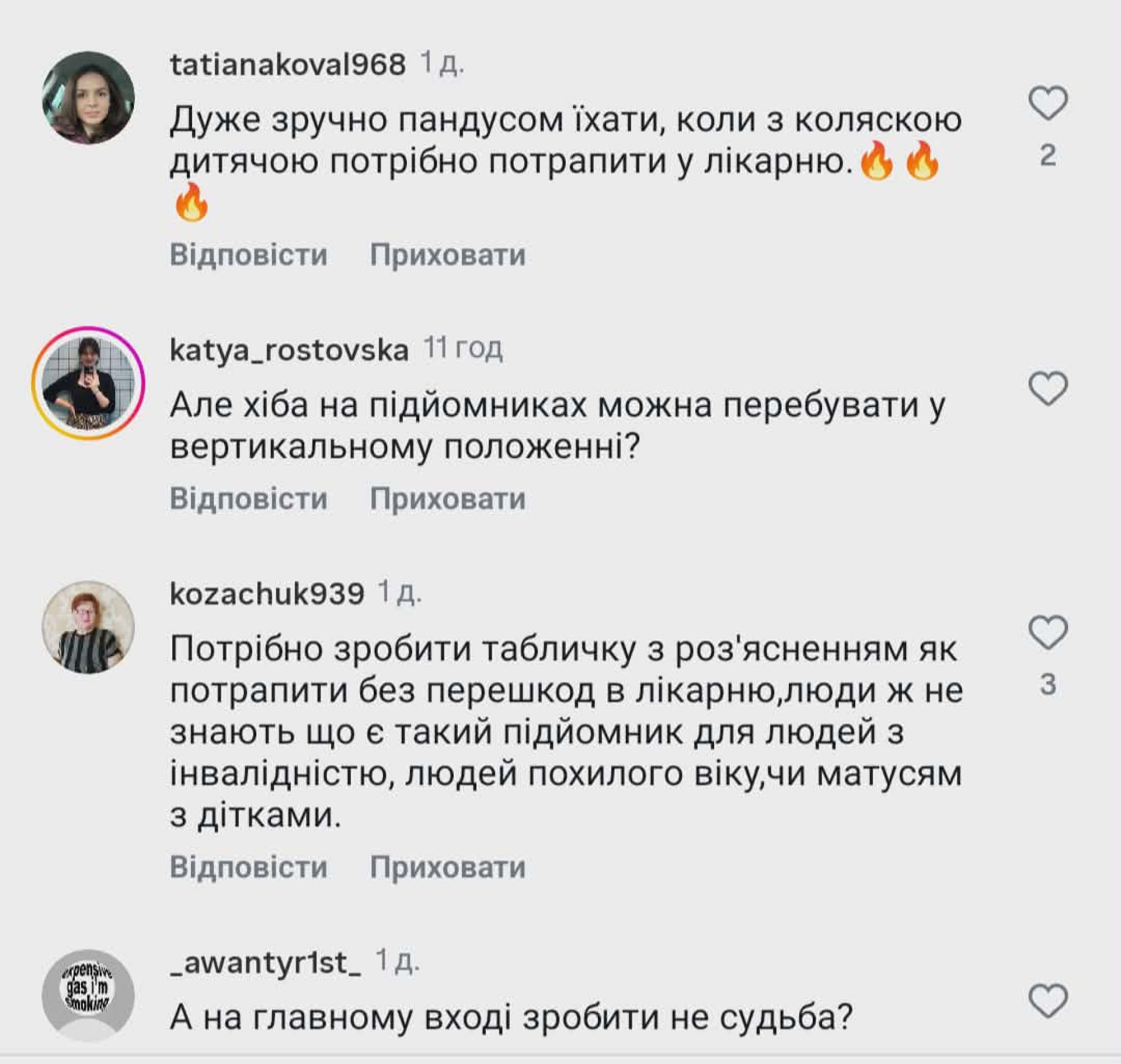 — Дуже важко їх долати і коли піднімаєшся, і коли спускаєшся з них. Особливо коли ти на милицях чи з палкою, — сказав чоловік. — У самій поліклініці є ліфт, він працює і це дуже зручно, бо кабінет травматолога і перев’язочна не на першому поверсі. А от сходи, вони як гора — такі круті. Напишіть, чому немає якогось пандуса, чи чому не зроблять ці сходи більші похиліші? От підніміть це питання, будь ласка.