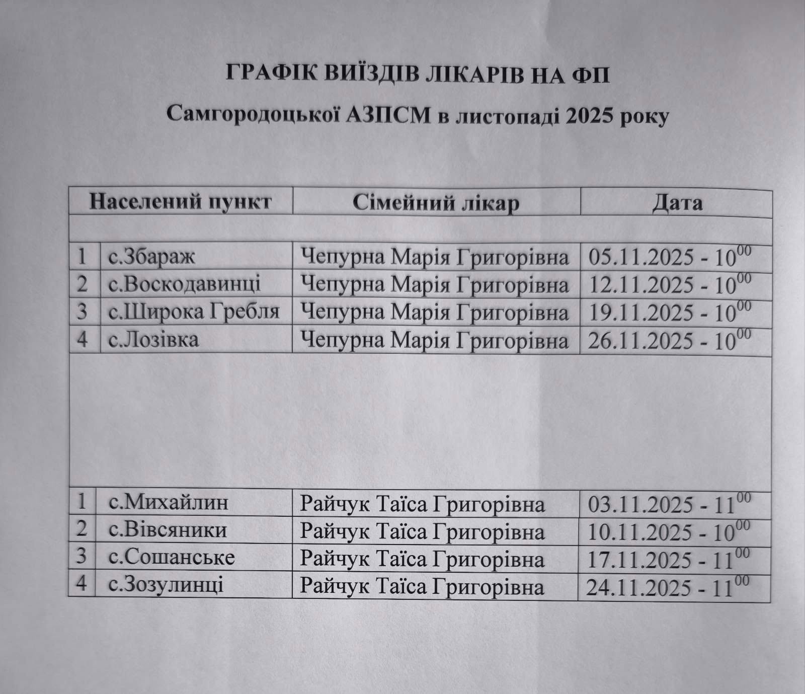 - Опублікували графік виїздів лікарів на фельдшерські пункти Самгородоцької громади в листопаді