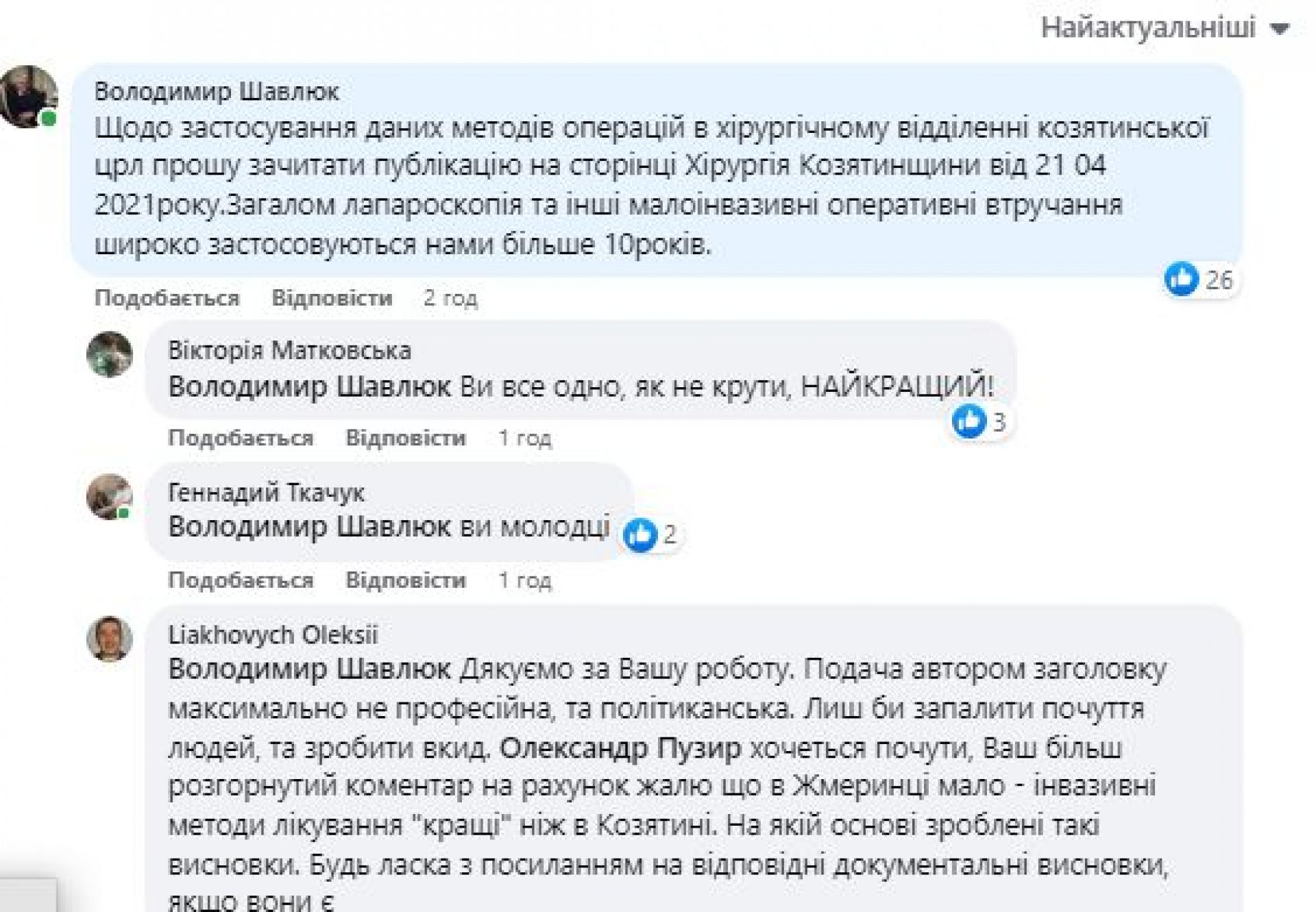 - Обговорення викликав заголовок, яким розпочинається допис: «Вітаємо Жмеринку. Шкода Козятин!». До нього долучився завідувач хірургічним відділенням Козятинської ЦРЛ Володимир Шавлюк