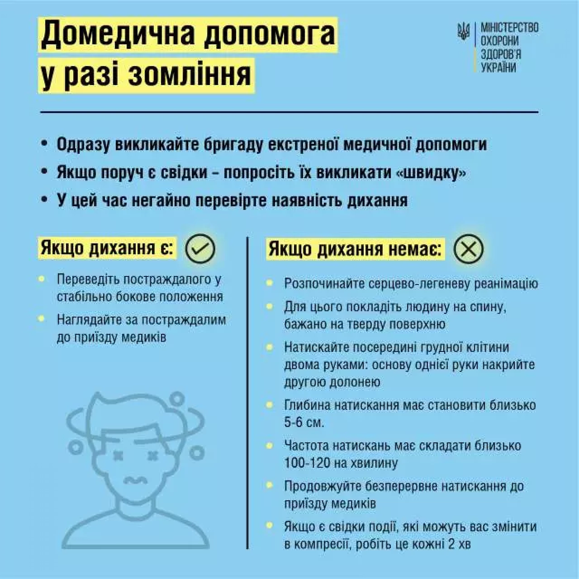 У МОЗ продовжують ділитись важливою та актуальною інформацією для українців на своїй сторінці у фейсбуці. Цього разу фахівці розповіли про домедичну допомогу у випадках, коли люди втрачають свідомість.