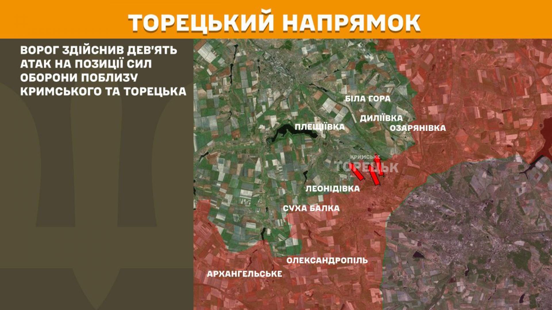 На Краматорському напрямку зафіксовано шість боєзіткнень в районах Часового Яру та Курдюмівки. На Торецькому напрямку ворог дев’ять разів атакував позиції Сил оборони поблизу Кримського та Торецька.