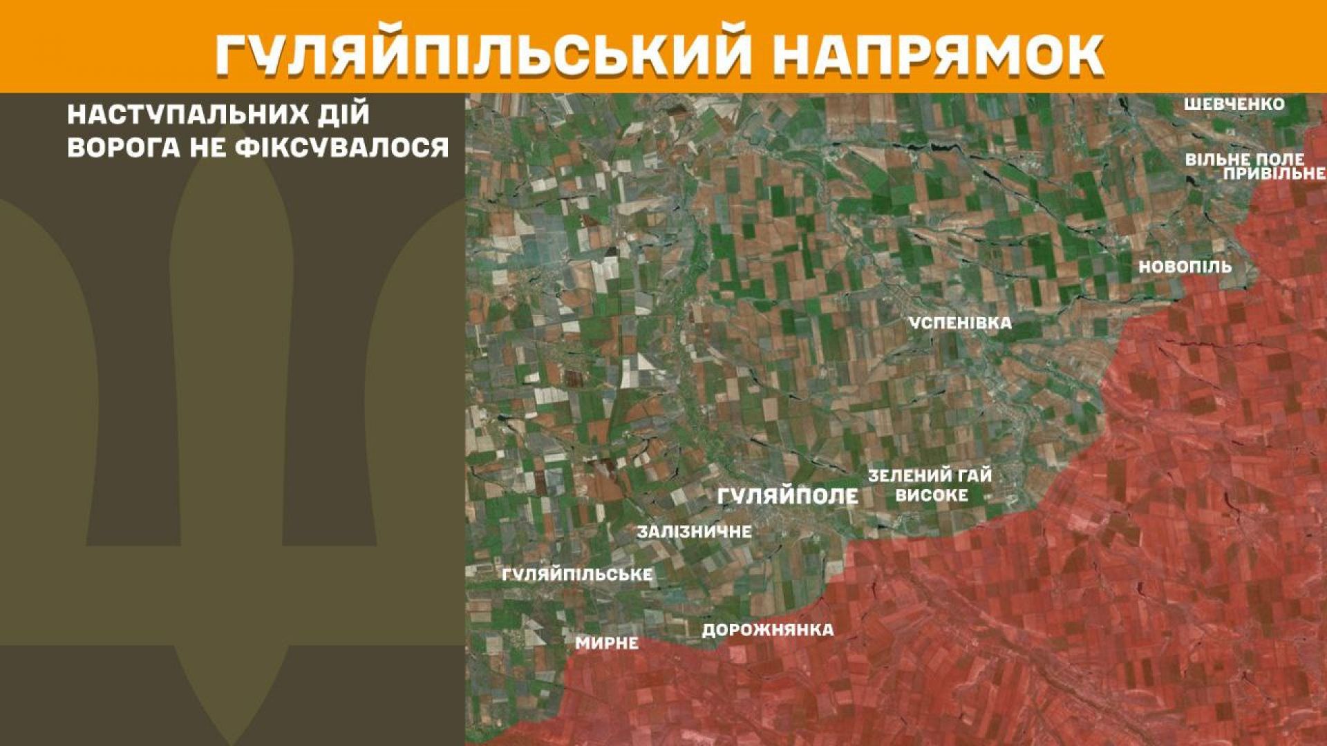 На Новопавлівському напрямку відбито 28 ворожих атак поблизу Розливу, Новосілки, Новополя, Привільного, Бурлацького та в напрямку Одрадного. На Оріхівському напрямку наші оборонці відбили три штурми в районах Степового та Щербаків. На Придніпровському напрямку зафіксовано п’ять безуспішних спроб ворога просунутися вперед.