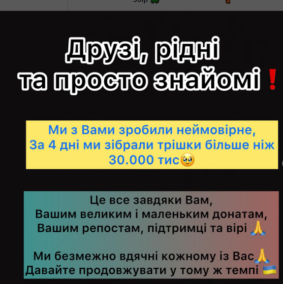 Наталія каже — люди потроху долучаються до збору. Особливо відгукнулися знайомі та близькі. Разом за чотири дні назбирали трохи більше 30 тисяч гривень.